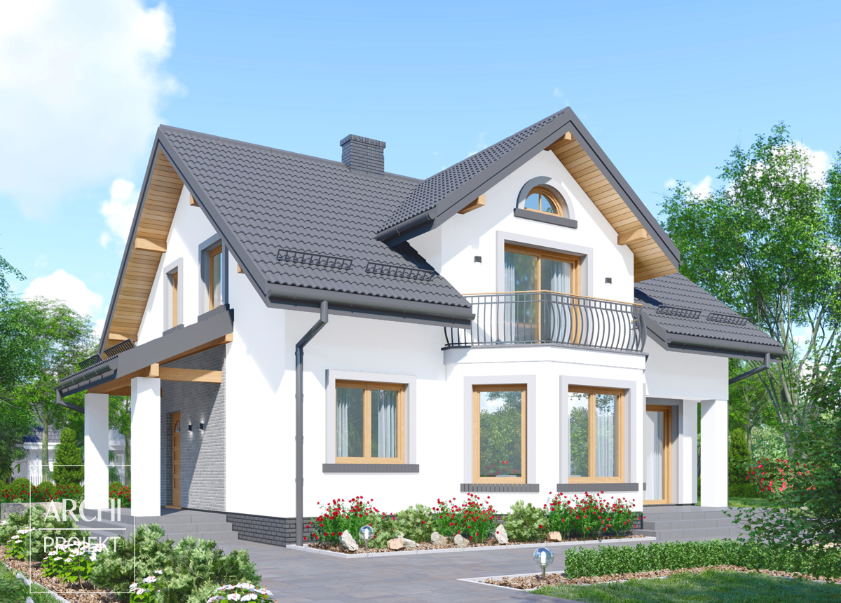 Solidny, średniej wielkości dom, o proporcjonalnej sylwetce i funkcjonalnym układzie pomieszczeń, dla 4-6 osobowej rodziny. Wejście do domu w elewacji bocznej pozwala na umieszczenie od frontu obu pokoi. Z przedsionka wejście do garderoby i na wprost do hallu. Pokój dzienny z wykuszowymi oknami, połączony jest z jadalnią. Sąsiadująca duża kuchnia ma powierzchnię umożliwiającą wydzielenie spiżarni. Dodatkowy pokój lub gabinet znajduje się obok salonu. Na poddaszu: trzy sypialnie, garderoby i piękna łazienka. W piwnicy: kotłownia i pomieszczenie gospodarcze. Możliwe zmiany adaptacyjne to między innymi: wydzielenie spiżarni z powierzchni kuchni, likwidacja piwnicy i przeniesienie pieca gazowego c.o. do łazienki. Dostępna wersja domu z wiatą garażową - APS 13+G. Zobacz także projekty - APS 44, APS 86.