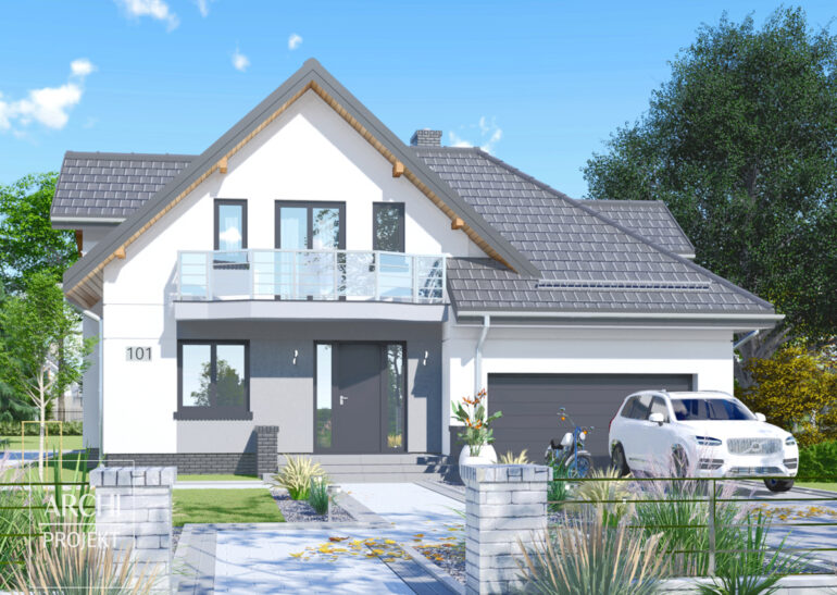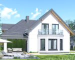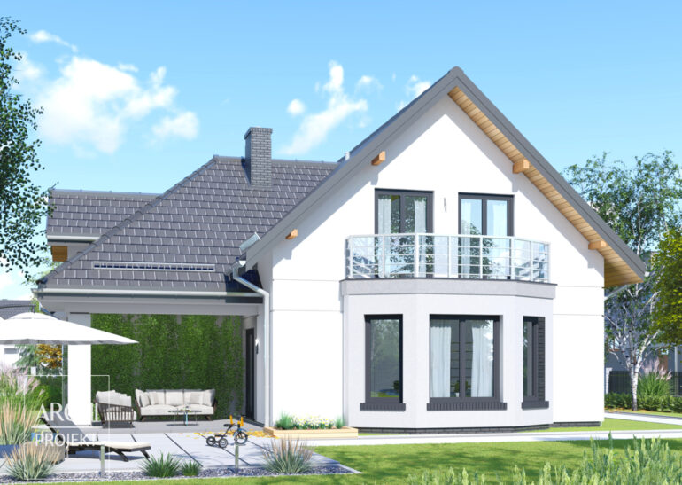 Nowoczesny, przestronny dom, przeznaczony dla 5-6 osobowej rodziny, z garażem dwustanowiskowym wkomponowanym w bryłę budynku. Wejście osłonięte balkonem prowadzi do przedsionka z miejscem na szafę wnękową. Od strony frontowej znajduje się pokój gościnny lub gabinet, dalej kuchnia ze spiżarnią i stołem śniadaniowym. Od strony ogrodowej - obniżony o 30cm, duży pokój dzienny z kominkiem, częścią wypoczynkową w szerokim wykuszu i częścią jadalną obok wyjścia na taras. Duży, zadaszony narożny taras umożliwi pobyt na nim nawet przy niesprzyjającej pogodzie. Garaż i pomieszczenia gospodarcze w poziomie terenu. Na poddaszu znajdują się trzy sypialnie, łazienka, pralnia, garderoba i duży strych.