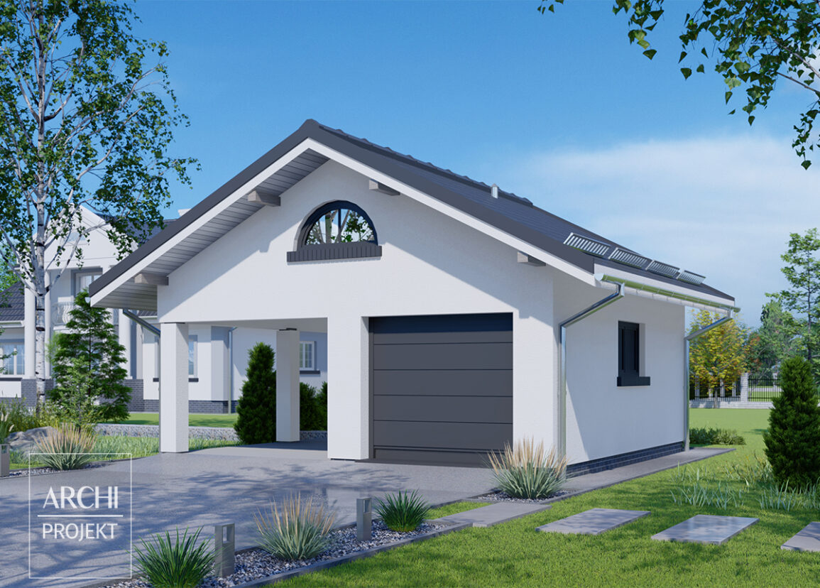 Budynek gospodarczy wolnostojący z dodatkową wiatą garażową. Istnieje opcja tego projektu jako garaż.