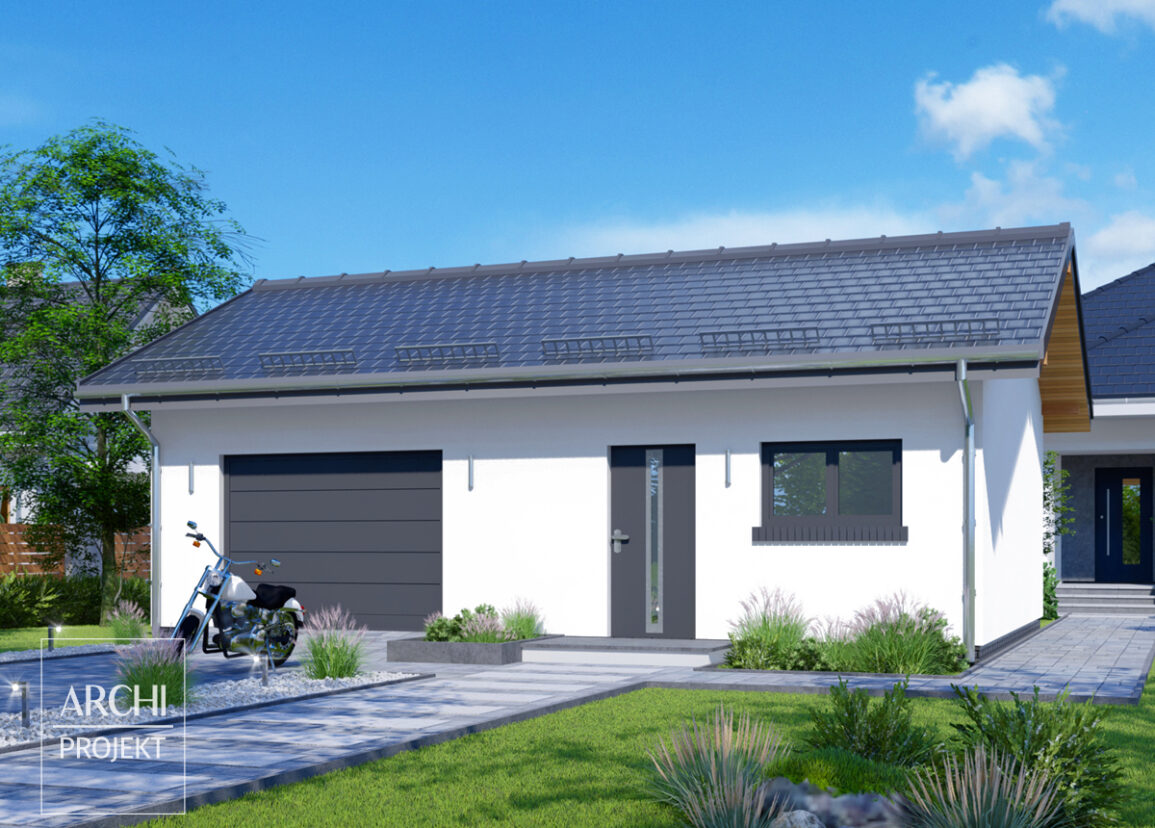 Garaż wolnostojący jednostanowiskowy o ponadstandardowej szerokości, z dużym pomieszczeniem gospodarczym obok. Istnieje opcja tego projektu jako budynek gospodarczy.
