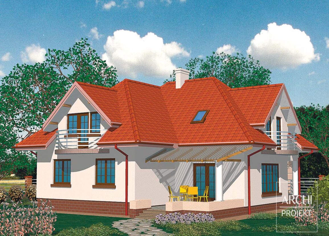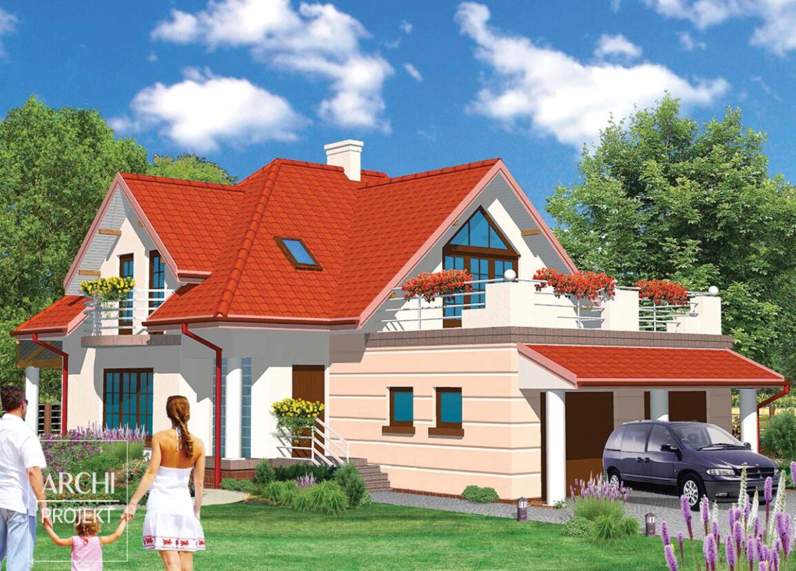 Ciekawie zaprojektowany dom, o oryginalnej sylwetce i funkcjonalnym wnętrzu, z dwoma garażami zlokalizowanymi od strony frontowej. Dom dla 5-7 osobowej rodziny prowadzącej aktywny tryb życia. Wejście do domu prowadzi przez przedsionek oświetlony ścianą pastelowych luksferów. Przestronny pokój dzienny (otwarty na elegancki hall z kolumnami) z kominkiem i dużym narożnym, osłoniętym dachem tarasem jest sercem tego domu. Na parterze znajdują się także: wygodna kuchnia z kącikiem śniadaniowym, łazienka z miejscem na piec gazowy c.o. i dwa małe pokoje w głębi. Na poddaszu mieszczą się: cztery wygodne sypialnie, każda z wyjściem na balkon, komfortowa łazienka i garderoby. Nad podwójnym garażem znajduje się duży taras będący wielką zaletą tego domu w ciepłych miesiącach roku. Możliwe zmiany adaptacyjne to między innymi: - połączenie dwóch małych pokoi na parterze, wykonanie podpiwniczenia.