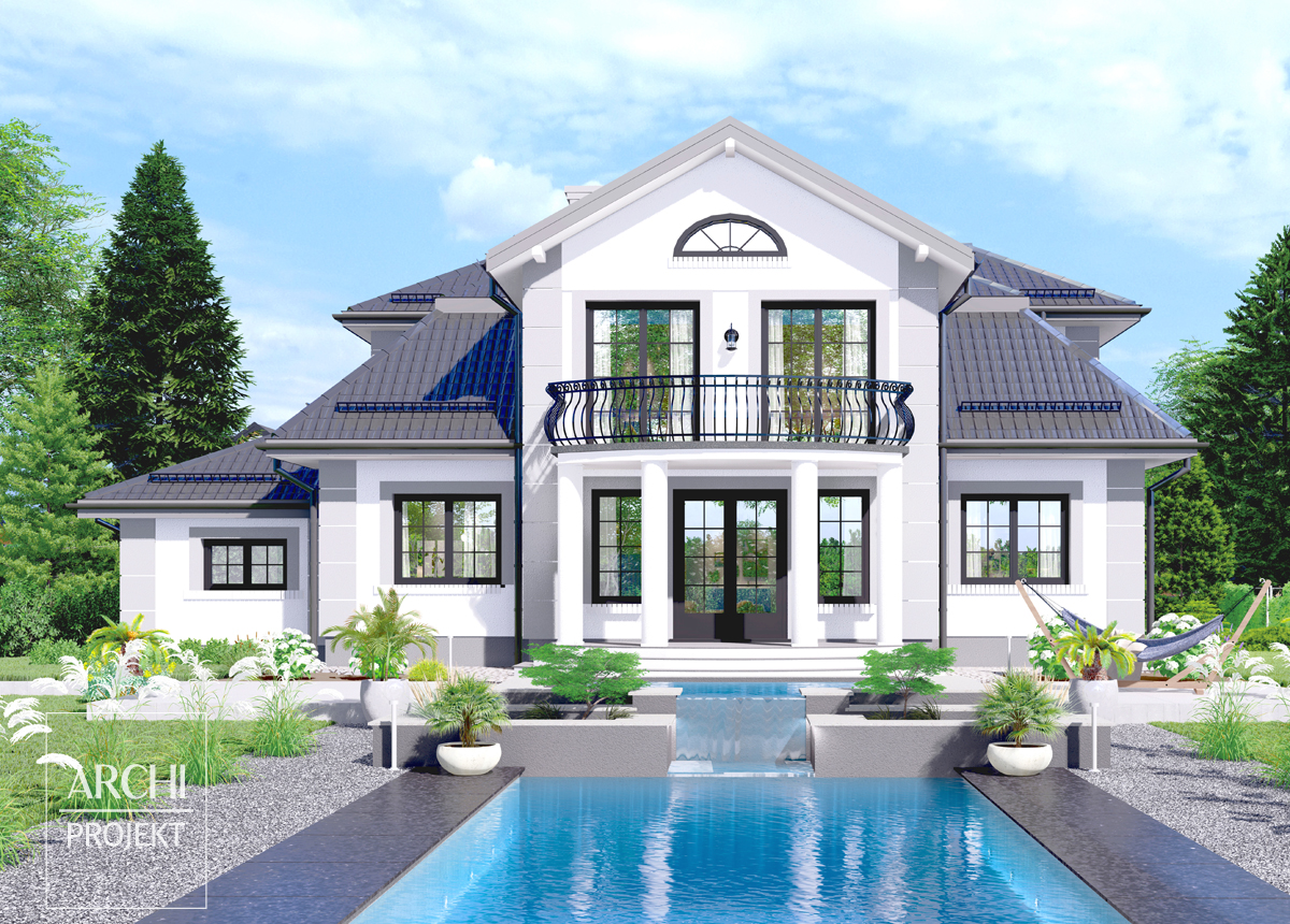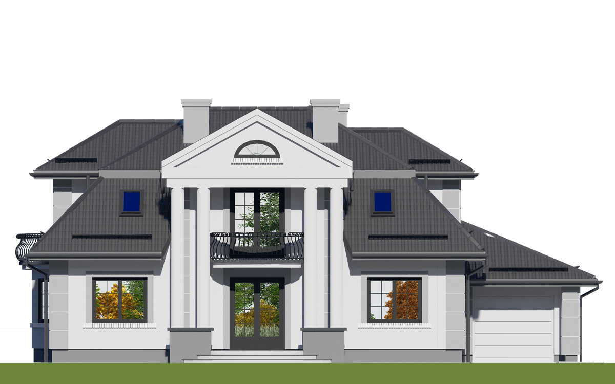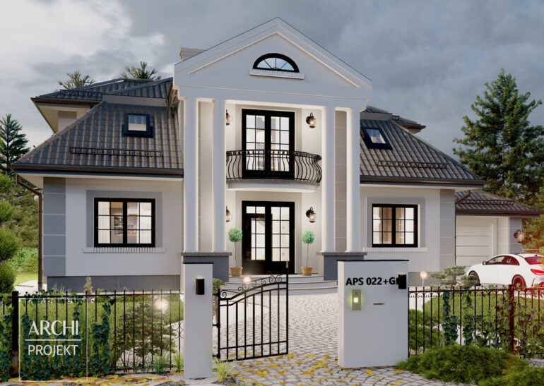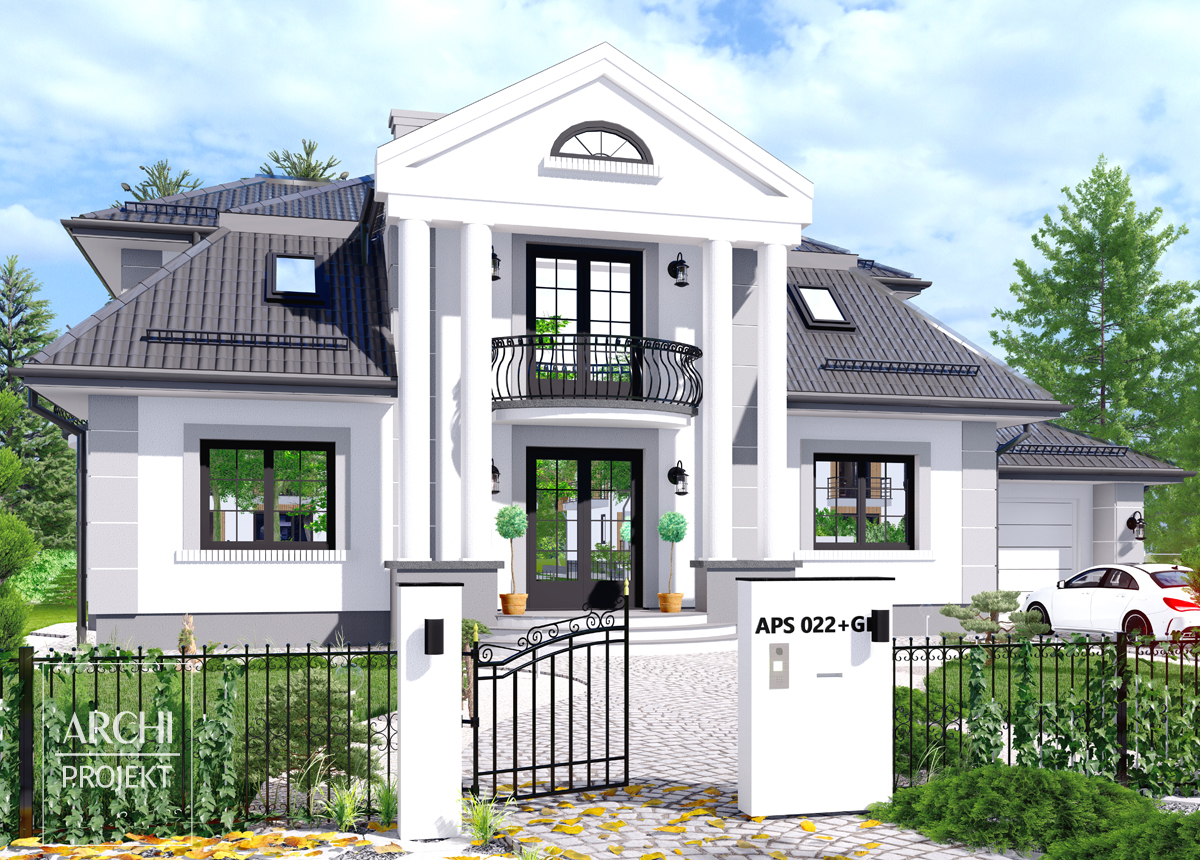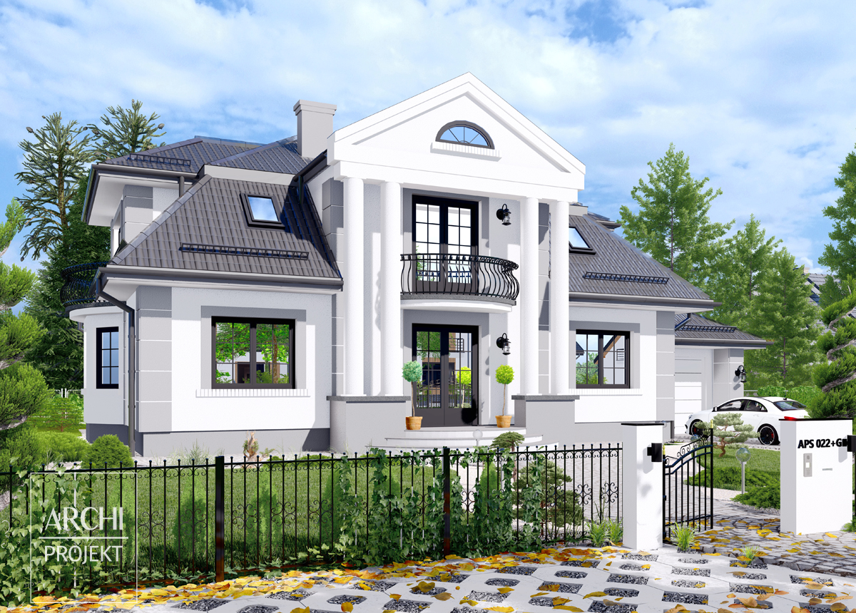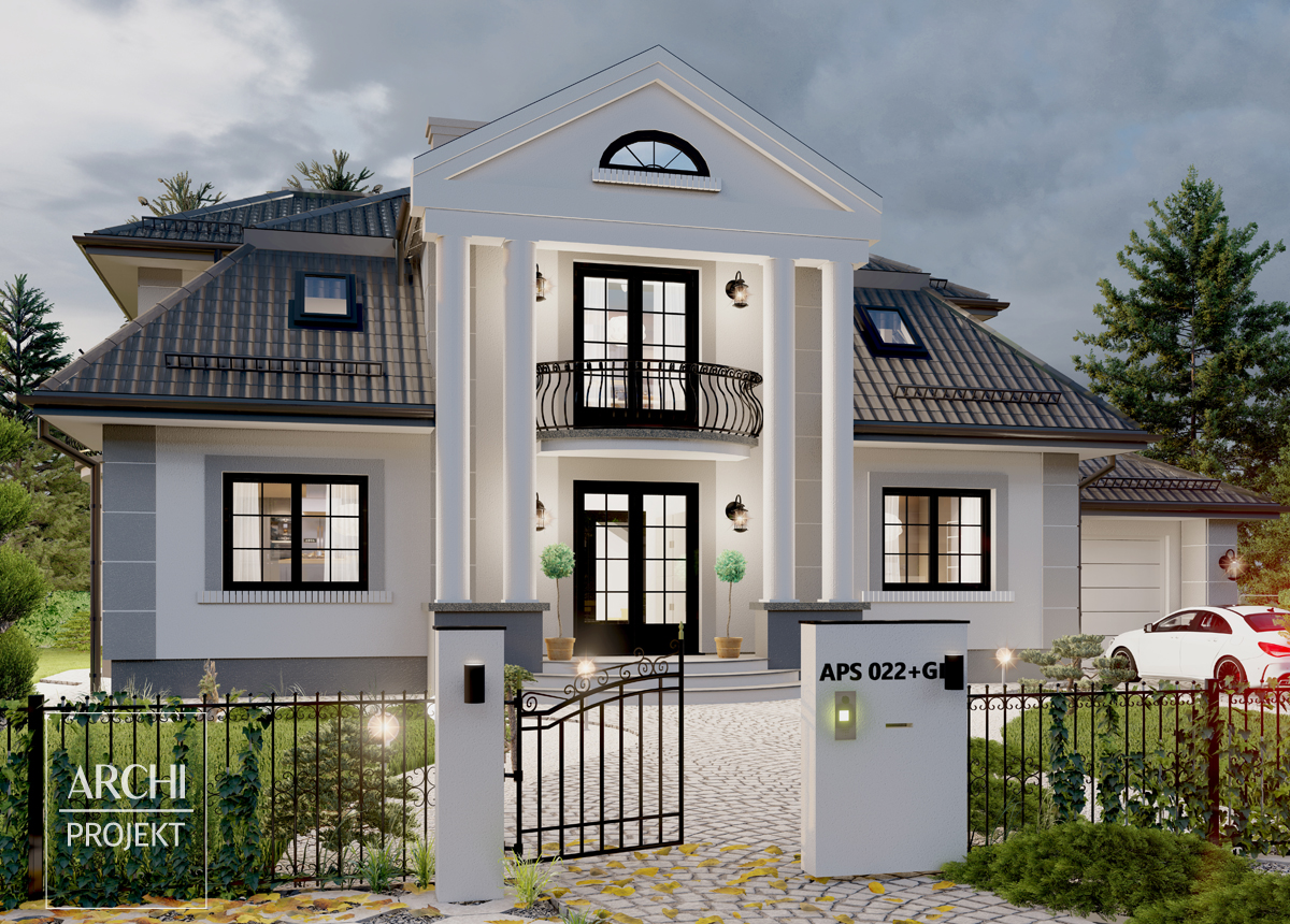 Obszerny, reprezentacyjny dom o klasycznej symetrycznej bryle i pięknym mansardowym dachu, dla 5-8 osobowej rodziny. Wejście na osi domu, pod strzelistym portykiem, do szerokiego przedsionka. Centralnie umieszczony otwarty hall wprowadza nas do wytwornego salonu z narożnym kominkiem, w którym nawet większe przyjęcia nie stanowią problemu. Obok - gabinet. Dla podkreślenia przestronności domu, sąsiadująca z salonem i kuchnią, jadalnia jest otwarta, co umożliwia także zaprezentowanie zalet efektownego układu wnętrz. Od frontu umieszczona jest dodatkowa sypialnia lub pokój gościnny. Obok schodów łazienka z miejscem na piec c.o. Na poddaszu znajdują się: cztery duże sypialnie z garderobami, oraz łazienka z suszarnią. Garaż dobudowany do boku domu. Dostępna wersja bez garażu - APS 022 oraz z piwnicą - APS 022+P. Możliwe zmiany adaptacyjne to między innymi: - rozdzielenie kuchni i jadalni ścianą z przejściem, - dodanie wykusza w pokoju dziennym. Dach w stylu polskim o zróżnicowanych spadkach od 24 do 48 stopni. Zobacz także projekty - APS 48, APS 106.