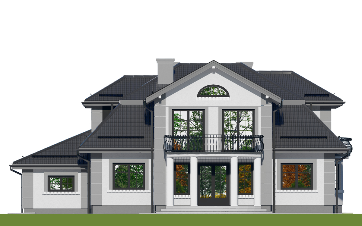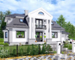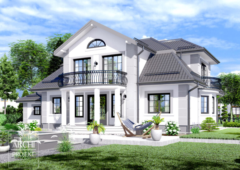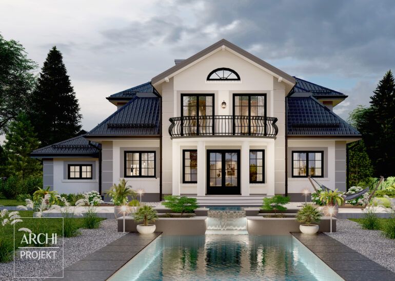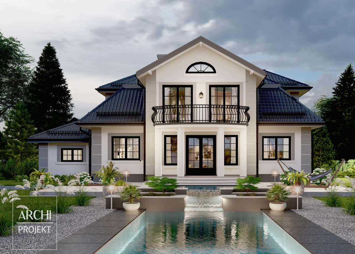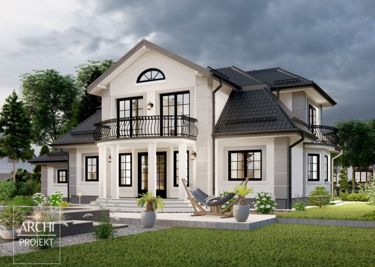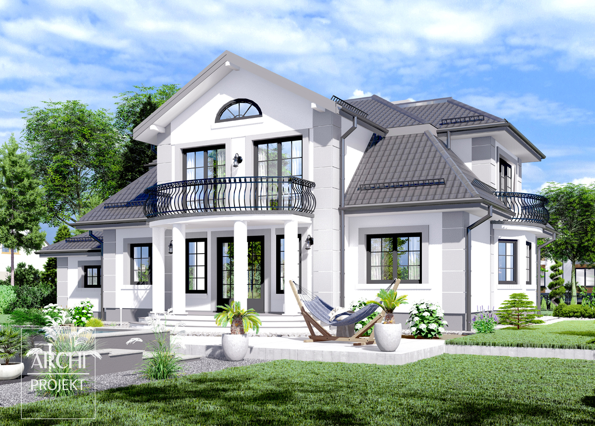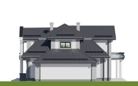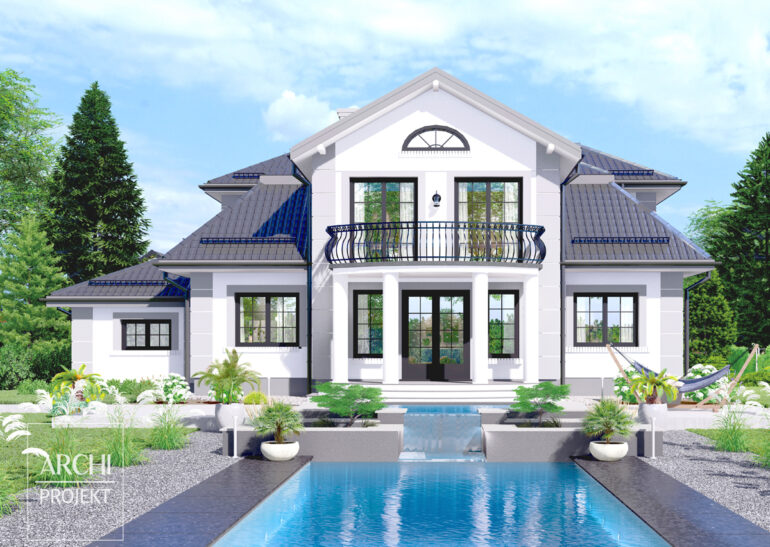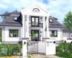 Obszerny, reprezentacyjny dom o klasycznej symetrycznej bryle i pięknym mansardowym dachu, dla 5-8 osobowej rodziny. Wejście na osi domu, pod strzelistym portykiem, do szerokiego przedsionka. Centralnie umieszczony otwarty hall wprowadza nas do wytwornego salonu z narożnym kominkiem, w którym nawet większe przyjęcia nie stanowią problemu. Obok - gabinet. Dla podkreślenia przestronności domu, sąsiadująca z salonem i kuchnią, jadalnia jest otwarta, co umożliwia także zaprezentowanie zalet efektownego układu wnętrz. Od frontu umieszczona jest dodatkowa sypialnia lub pokój gościnny. Obok schodów łazienka z miejscem na piec c.o. Na poddaszu znajdują się: cztery duże sypialnie z garderobami, oraz łazienka z suszarnią. Garaż dobudowany do boku domu. Dostępna wersja bez garażu - APS 022 oraz z piwnicą - APS 022+P. Możliwe zmiany adaptacyjne to między innymi: - rozdzielenie kuchni i jadalni ścianą z przejściem, - dodanie wykusza w pokoju dziennym. Dach w stylu polskim o zróżnicowanych spadkach od 24 do 48 stopni. Zobacz także projekty - APS 48, APS 106.