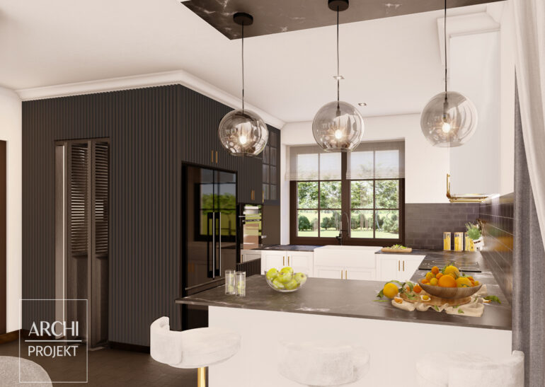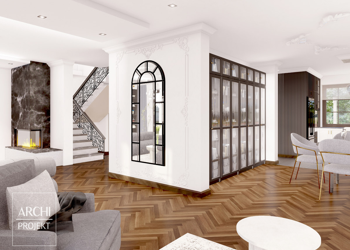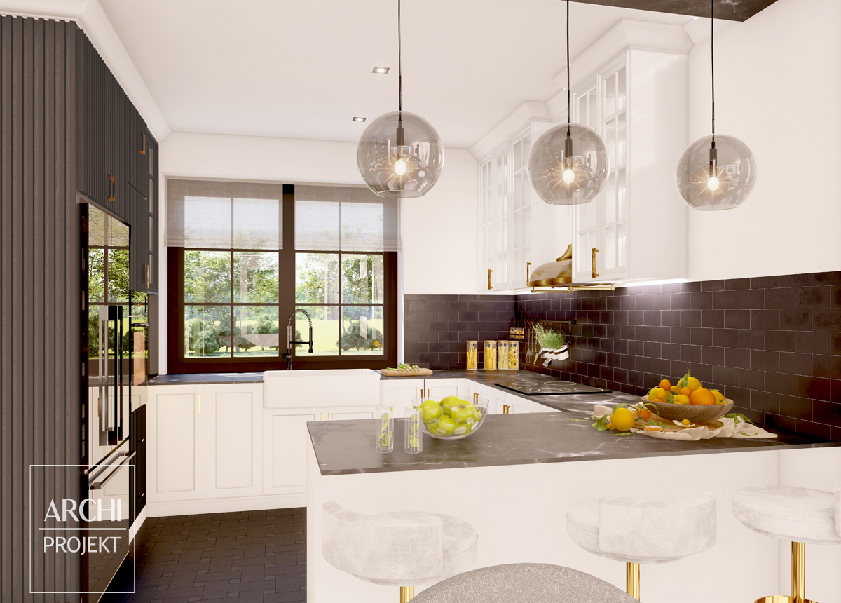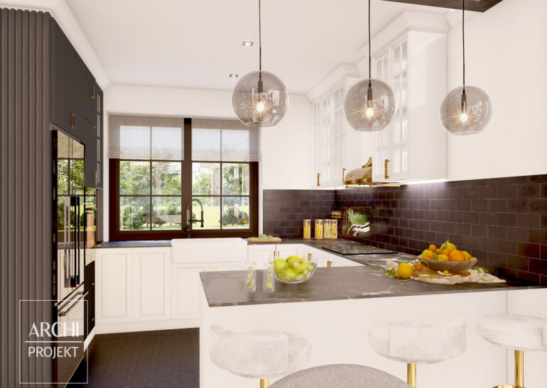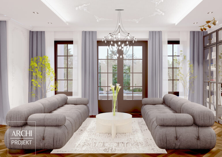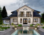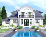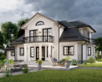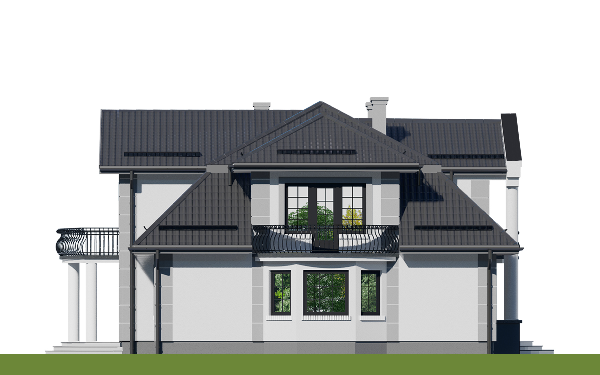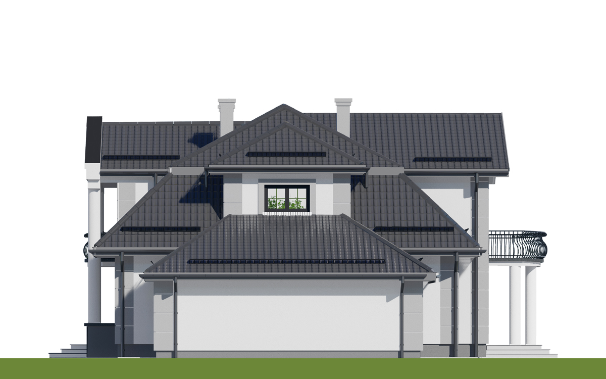 Obszerny, reprezentacyjny dom o klasycznej symetrycznej bryle i pięknym mansardowym dachu, dla 5-8 osobowej rodziny. Wejście na osi domu, pod strzelistym portykiem, do szerokiego przedsionka. Centralnie umieszczony otwarty hall wprowadza nas do wytwornego salonu z narożnym kominkiem, w którym nawet większe przyjęcia nie stanowią problemu. Obok - gabinet. Dla podkreślenia przestronności domu, sąsiadująca z salonem i kuchnią, jadalnia jest otwarta, co umożliwia także zaprezentowanie zalet efektownego układu wnętrz. Od frontu umieszczona jest dodatkowa sypialnia lub pokój gościnny. Obok schodów łazienka z miejscem na piec c.o. Na poddaszu znajdują się: cztery duże sypialnie z garderobami, oraz łazienka z suszarnią. Garaż dobudowany do boku domu. Dostępna wersja bez garażu - APS 022 oraz z piwnicą - APS 022+P. Możliwe zmiany adaptacyjne to między innymi: - rozdzielenie kuchni i jadalni ścianą z przejściem, - dodanie wykusza w pokoju dziennym. Dach w stylu polskim o zróżnicowanych spadkach od 24 do 48 stopni. Zobacz także projekty - APS 48, APS 106.