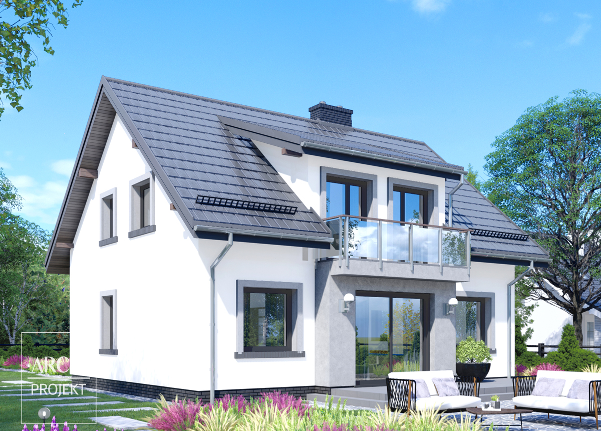 Nowoczesny dom o atrakcyjnej sylwetce i praktycznym układzie pomieszczeń, przeznaczony dla 4-6 osobowej rodziny. Wejście do domu, osłonięte opartym na słupach okapem dachu, prowadzi do przedsionka z szafą wnękową i dalej do centralnie usytuowanego hallu. Od frontu znajduje się obszerna kuchnia z kącikiem jadalnym i spiżarnią. W głębi domu - wygodny pokój dzienny z kominkiem i wyjściem na obszerny taras. Na parterze także: drugi mniejszy pokój lub gabinet, oraz mała łazienka. Na poddaszu znajdują się: trzy sypialnie, łazienka i garderoba. Zaletą projektu jest prosta konstrukcja zapewniająca łatwą realizację. Zobacz także projekty: APS 32+G, APS 32+P+G, APS 74, APS 146, APS 203.