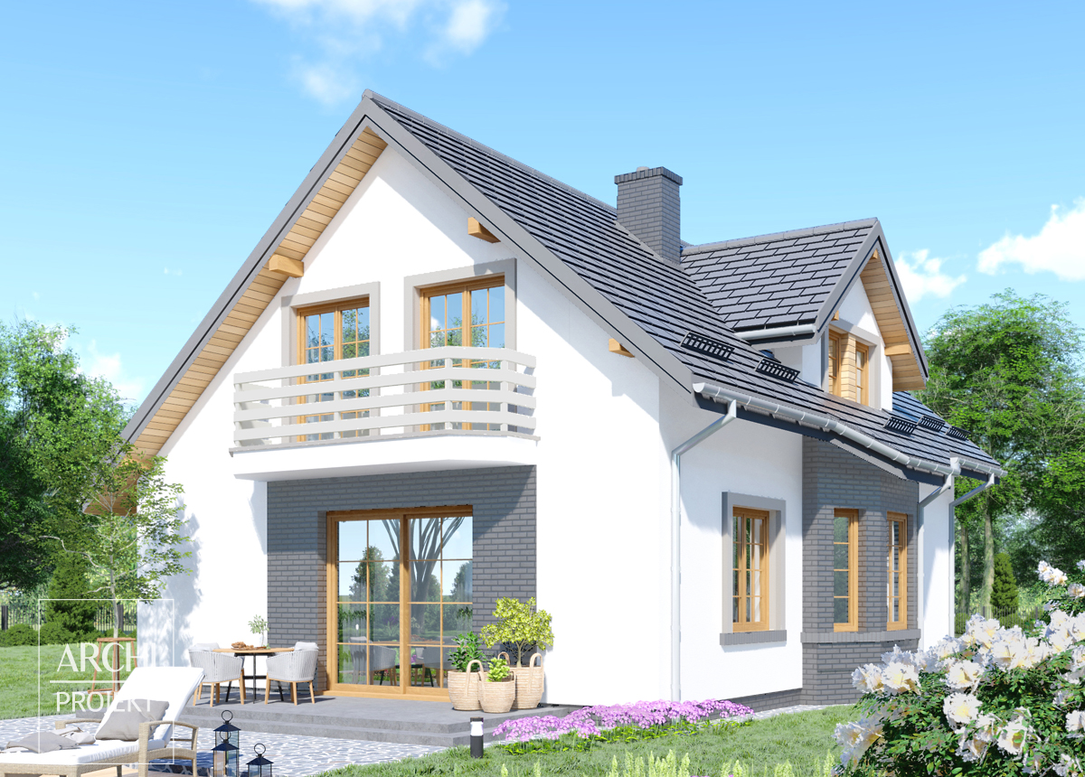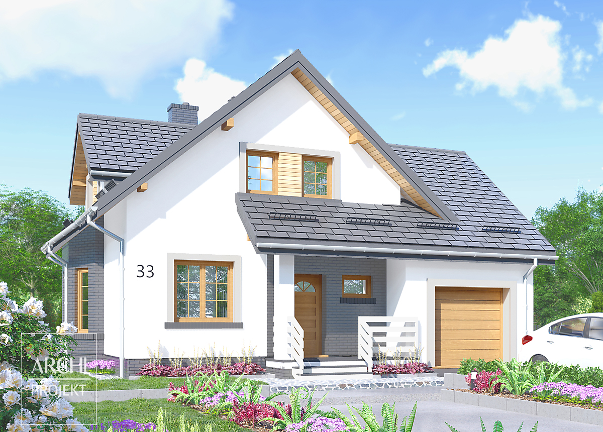 Sympatyczny, funkcjonalny dom dla 4-5 osobowej rodziny, z wkomponowanym w bryłę budynku garażem. Wejście do domu, osłonięte daszkiem, prowadzi do przedsionka z garderobą i dalej do hallu z otwartą klatką schodową. Od frontu zlokalizowana jest kuchnia sąsiadująca z jadalnią. W głębi domu - pokój dzienny z kominkiem i obniżonym poziomem podłogi. Szerokie wyjście na taras zapewnia bezpośredni kontakt z ogrodem. Obok pokoju dziennego - sypialnia lub gabinet. Na parterze także: wc garaż i kotłownia. Na poddaszu znajdują się: trzy sypialnie, garderoba, obszerna łazienka i strych nad garażem. Dostępna także wersja projektu z garażem dwustanowiskowym - APS 33+2G. Możliwe zmiany adaptacyjne to między innymi: połączenie pokoi na parterze i dodanie wykusza pod balkonem, adaptacja strychu na pomieszczenie rekreacyjne lub mieszkalne, wykonanie częściowego podpiwniczenia. Zobacz także projekt: APS 033 NEW.
