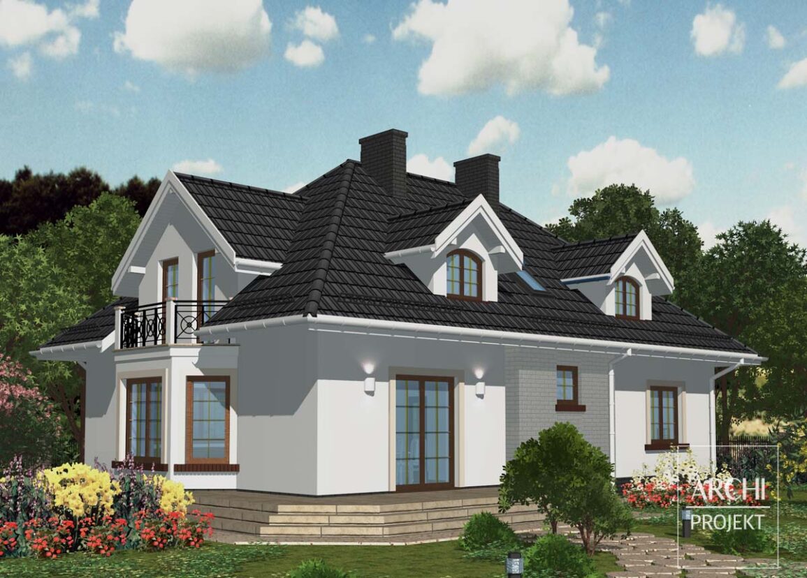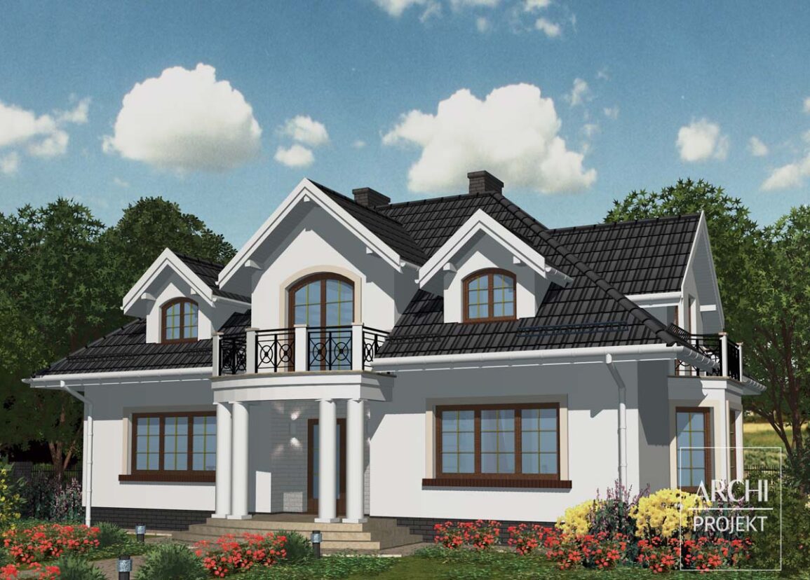Reprezentacyjny dom, o przyciągającej wzrok atrakcyjnej sylwetce i kolorystyce, dla 5-7 osobowej rodziny. Układ funkcjonalny umożliwia adaptację na dom dwupokoleniowy. Wejście do domu, osłonięte opartym na kolumnach łukowym balkonem, prowadzi przez przedsionek z miejscem na szafę wnękową do eleganckiego hallu. Na prawo znajduje się przestronny salon z jadalnią, kominkiem i przeszklonym wykuszem. Pokój dzienny zajmuje całą szerokość domu, więc w zależności od usytuowania działki można usytuować taras z najbardziej korzystnej strony. Po drugiej stronie hallu - pokój gościnny lub gabinet (może także być przeznaczony dla starszego pokolenia), w głębi duża kuchnia ze spiżarnią i wc. Wygodne schody zamykające hall prowadzą na poddasze, gdzie znajdują się cztery pokoje, proporcjonalna łazienka i garderoba. W podpiwniczeniu kotłownia i pomieszczenia gospodarcze. Dostępna wersja z pojedyńczym lub podwójnym garażem.