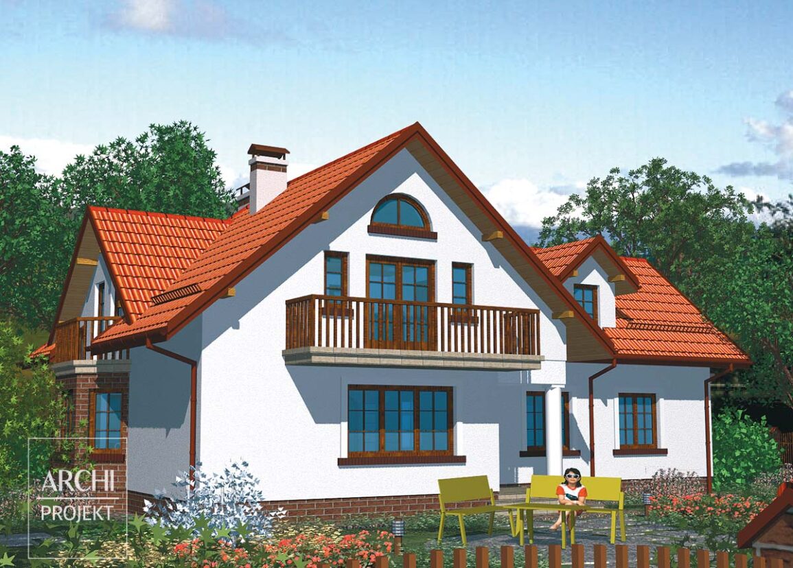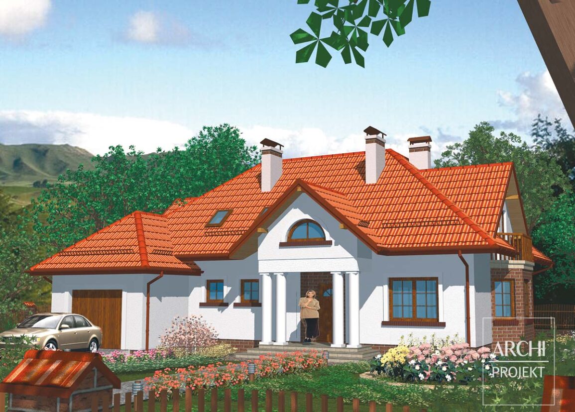 Efektowny dom dla 5-7 osobowej rodziny, nawiązujący formą do tradycyjnej polskiej architektury, z portykiem wejściowym opartym na zdwojonych kolumnach. Interesująco zaprojektowany dom z możliwością adaptacji na dwupokoleniowy, z garażem wkomponowanym w bryłę budynku. Osłonięte wejście prowadzi do przedsionka z szafą wnękową i dalej do hallu na osi wejścia. Od frontu znajduje się duża kuchnia z jadalnią z wykuszowymi oknami. Na wprost wejścia - obszerny pokój dzienny z kominkiem, sąsiadujący z otwartą jadalnią. W głębi domu - dwa dodatkowe pokoje, łazienka z piecem c.o. i wc, oraz obniżony garaż. Na poddaszu - trzy sypialnie, dwie łazienki, garderoby i strych. Możliwe zmiany adaptacyjne: - dodanie wykusza w pokoju dziennym, - wydzielenie spiżarni z powierzchni kuchni, - adaptacja strychu na pomieszczenie rekreacyjne, - wykonanie podpiwniczenia z kotłownią.