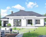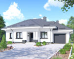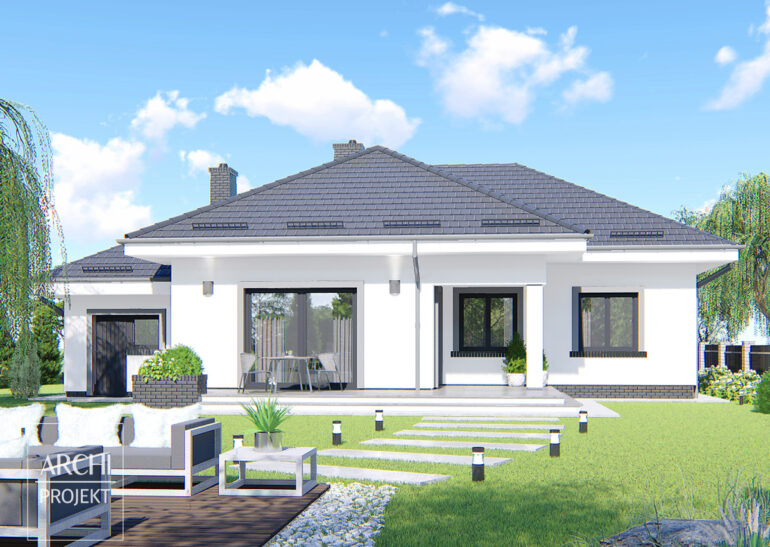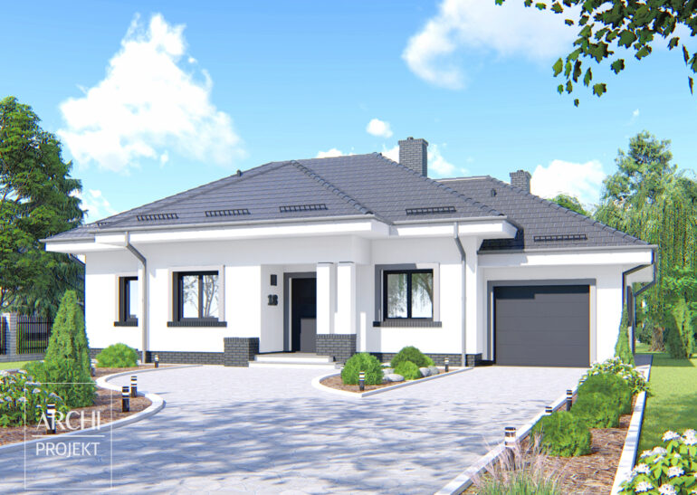 Zgrabny i funkcjonalny, parterowy dom dla 4-5 osobowej rodziny. Wejście do domu, osłonięte podcieniem, prowadzi do przedsionka z szafą ubraniową i dalej do centralnie usytuowanego hallu. Znajdująca się od frontu kuchnia, obejmuje widokiem wejście i wjazd na działkę. Za kuchnią usytuowane jest c i spiżarnia. Połączenie spiżarni z garażem pozwala na wygodne dostarczanie zakupów. W głębi domu, na wprost wejścia, znajduje się duży pokój dzienny z kominkiem i wyjściem na osłonięty dachem taras. Część sypialna, odizolowana od części dziennej, zawiera trzy foremne sypialnie i praktyczną łazienkę. Obok łazienki - kotłownia. Konstrukcja domu pozwala na łatwą rozbudowę części sypialnej, dla uzyskania dodatkowych pokoi sypialnych. Możliwe zmiany adaptacyjne to między innymi: - powiększenie pokoju dziennego lub dodanie wykusza, - poszerzenie garażu na dwustanowiskowy, - przeniesienie kotłowni za garaż, - adaptacja strychu na pomieszczenia użytkowe.