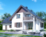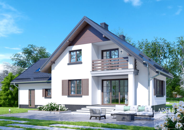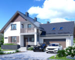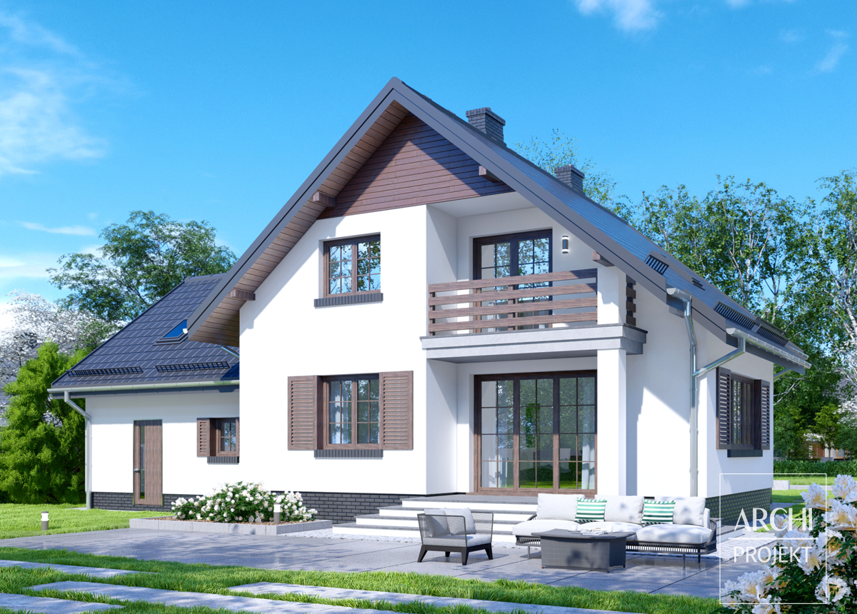 Ekonomiczny dom dla 4-6 osobowej rodziny, z garażem dwustanowiskowym wkomponowanym w bryłę domu. Obok centralnie umieszczonego wejścia do domu - obszerna kuchnia ze spiżarnią. W głębi domu - zgrabny pokój dzienny z kominkiem i wyjściem na szeroki taras. Naprzeciw wejścia do pokoju - efektowna klatka schodowa prowadząca na poddasze i kilka stopni w dół do garażu i kotłowni. Na parterze także: dodatkowy pokój - gabinet i łazienka. Na poddaszu: trzy sypialnie (łatwe do umeblowania w kilku wersjach), duża łazienka i garderoba. Na półpiętrze nad garażem strych do wykorzystania na dodatkowy pokój lub pomieszczenie rekreacyjne. Dostępna wersja z garażem jednostanowiskowym - APS 55.