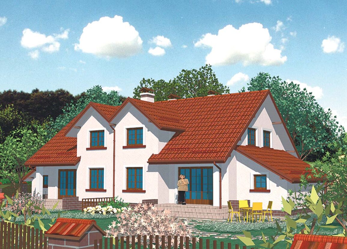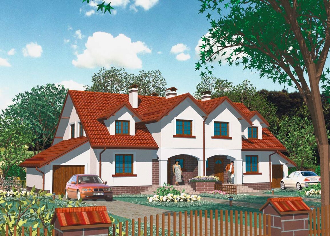 Wygodny, stylowy dom bliźniaczy, częściowo podpiwniczony, z garażem. Segment bliźniaka dla 5-6 osobowej rodziny. Wejście do domu zaakcentowane nadwieszonym frontonem. Od strony wejściowej zlokalizowana jest kuchnia z częścią jadalną, za nią znajduje się zgrabny pokój dzienny z wyjściem na obszerny taras. Drugi, mniejszy pokój - w głębi domu. Otwarte schody prowadzą z hallu na poddasze, gdzie znajdują się trzy wygodne sypialnie, oraz obszerna łazienka. W piwnicy znajduje się kotłownia i pomieszczenie gospodarcze. Garaż, usytuowany w poziomie terenu, zamyka bryłę budynku z boku, tworząc przyjemną dla oka harmonijną zabudowę. Możliwe zmiany adaptacyjne: - likwidacja ściany pomiędzy kuchnią a pokojem dziennym, - likwidacja garażu lub przeniesienie garażu do piwnicy w celu usytuowania budynku na wąskiej działce. POWYŻSZA CENA DOTYCZY JEDNEGO SEGMENTU