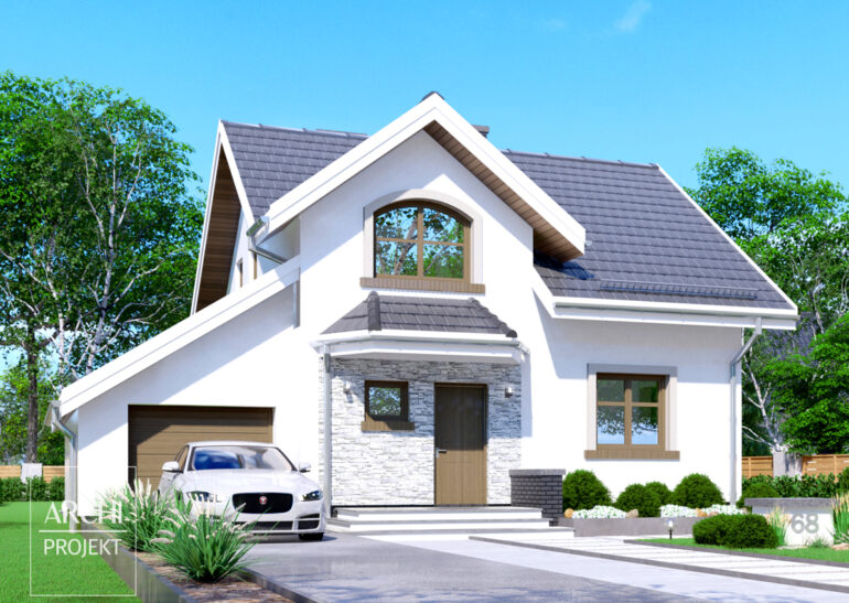 Niewielki, ekonomiczny dom o sympatycznej sylwetce dla 4 osobowej rodziny, z garażem dobudowanym do ściany domu. Szeroki przedsionek posiada miejsce na szafy ubraniowe. Zlokalizowana od frontu wygodna kuchnia z kącikiem jadalnym - posiada widok na wejście do domu. Pokój dzienny może łączyć funkcję wypoczynkową z jadalną. Wyjście na obszerny taras, który posiada zadaszenie, umożliwia korzystanie z niego przez większość roku. Na parterze znajdują się także: spiżarnia, wc i obniżona kotłownia - z wejściem pod schodami. Na poddaszu znajdują się: trzy foremne sypialnie i łazienka. Możliwe zmiany adaptacyjne, m.in.: - wykonanie przejścia z domu do garażu i wejścia stamtąd do kotłowni, - wykonanie kominka w salonie - po przeniesieniu lub dodaniu komina, - rezygnacja z kotłowni (w przypadku ogrzewania gazem), co pozwoli na powiększenie łazienki. - wykonanie podpiwniczenia.