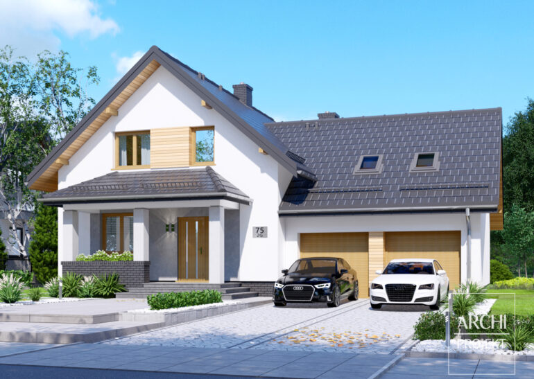 Zgrabny dom o spokojnej sylwetce i czytelnym układzie pomieszczeń dla 4-6 osobowej rodziny, z garażem dwustanowiskowym wkomponowanym w bryłę domu. Wejście pod opartym na filarach daszkiem prowadzi do przedsionka z szafą wnękową. Od frontu - wygodna kuchnia, w głębi domu - zgrabny pokój dzienny. Istnieje możliwość połączenia kuchni z pokojem dziennym. Znajdujący się w salonie kominek może być wykorzystywany w chłodniejszych okresach roku. Na parterze także: drugi mniejszy pokój i łazienka. Na poddaszu mieszczą się: trzy sypialnie, garderoby i łazienka. Za garażem, usytuowanym w poziomie terenu znajduje się kotłownia. Możliwa jest adaptacja strychu na dodatkowy pokój lub pomieszczenie rekreacyjne oraz wykonanie podpiwniczenia. Dostępna jest wersja tego projektu z pojedyńczym garażem - symbol APS 075.