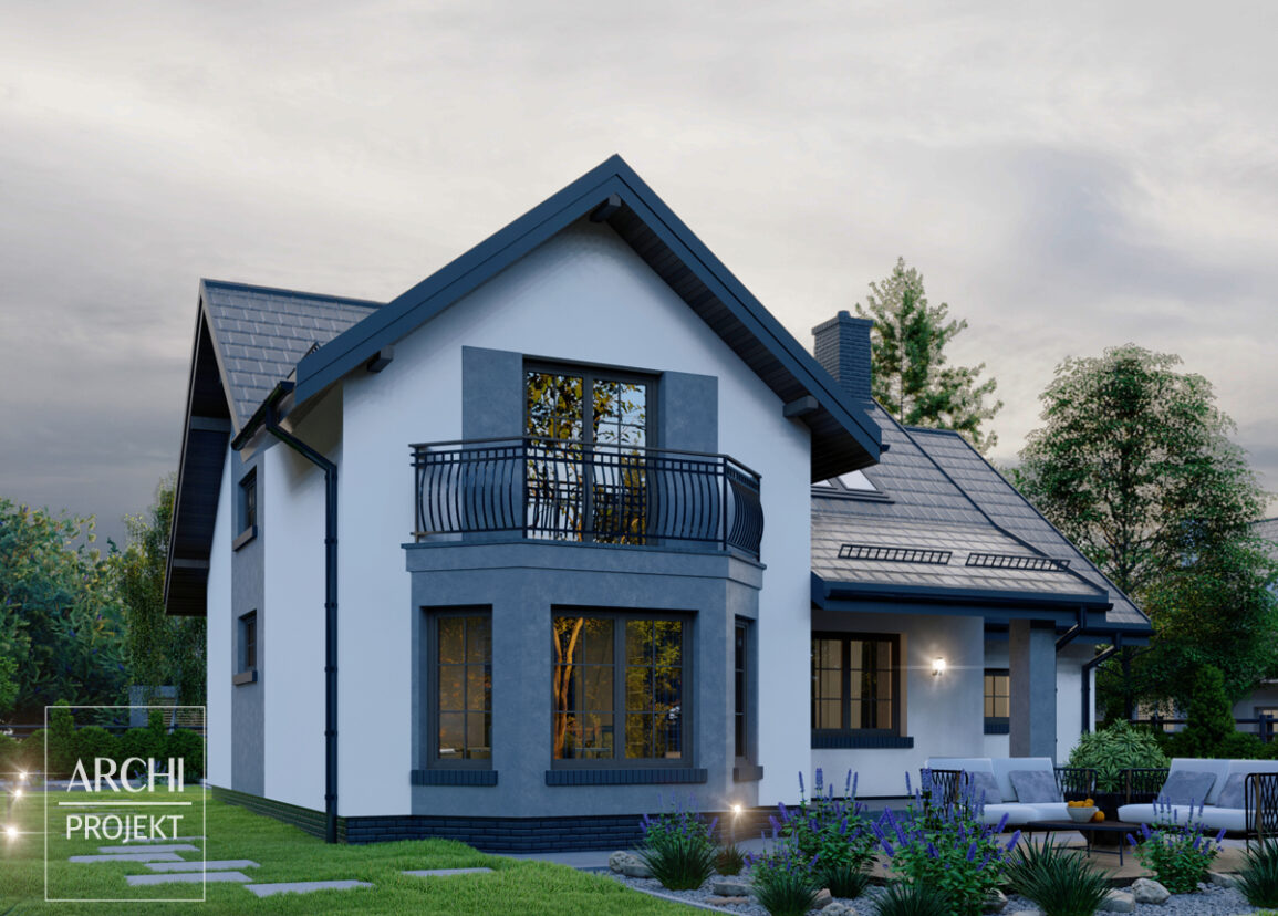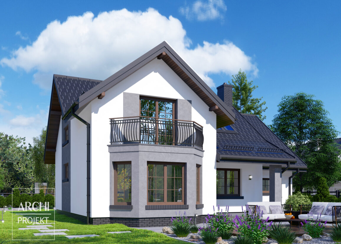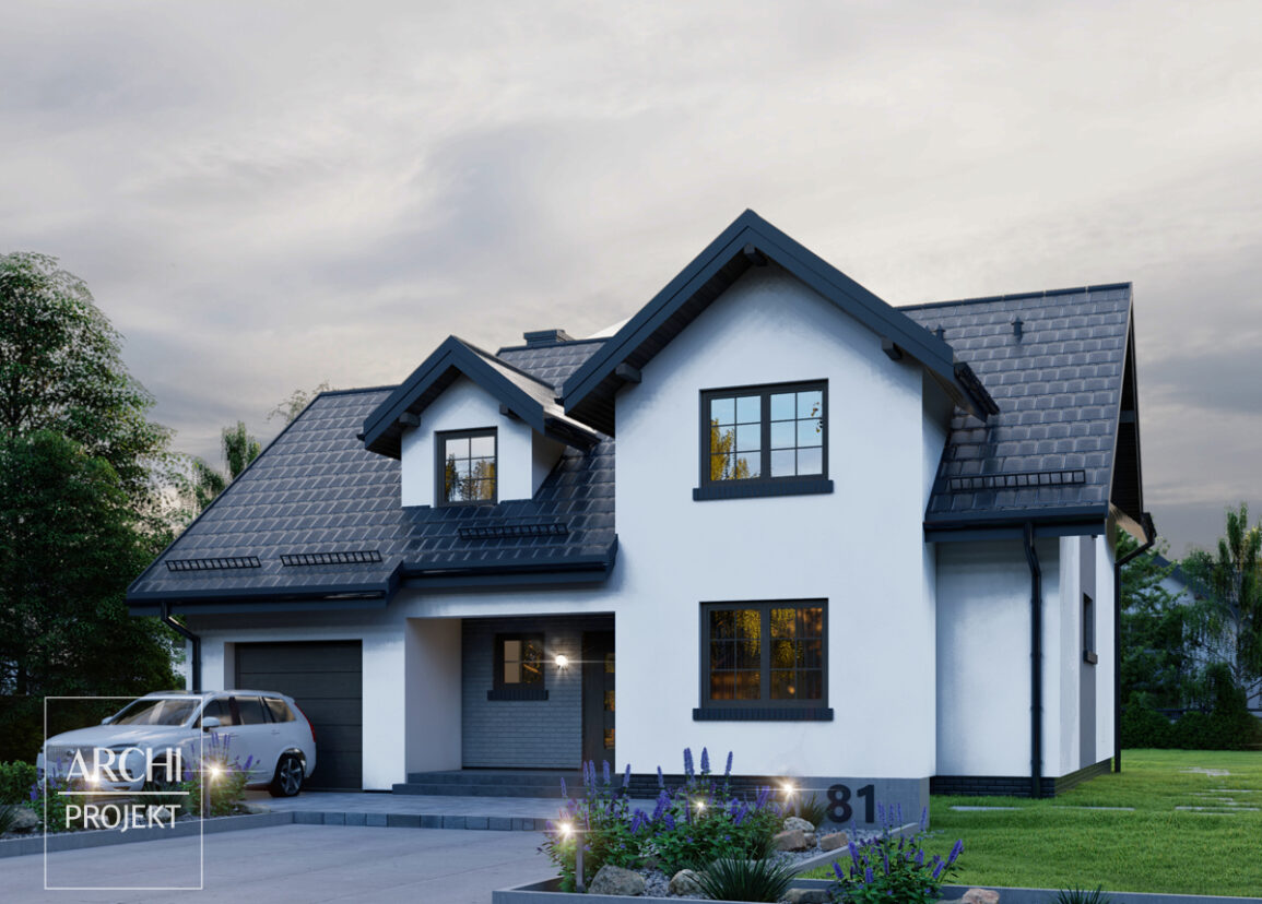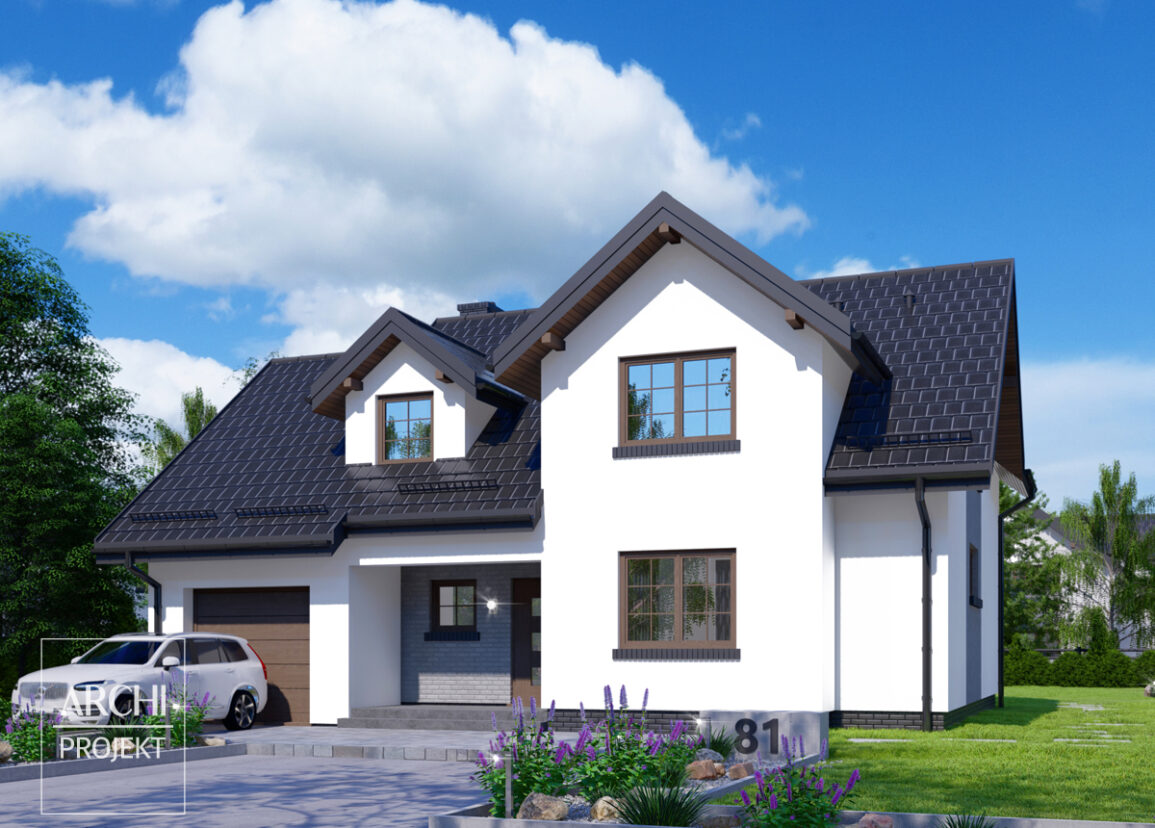 Nowoczesny, praktycznie urządzony, pełen uroku dom dla 4-5 osobowej rodziny, z garażem wkomponowanym w bryłę domu. Wjazd do garażu i wejście do domu, osłonięte okapem dachu, usytuowane w bliskim sąsiedztwie. Od frontu, oprócz wiatrołapu z garderobą, zlokalizowana jest kuchnia ze spiżarnią. W głębi domu znajduje się obszerny pokój dzienny z efektownym wykuszem. Na parterze także: drugi, mniejszy pokój i łazienka. Garaż i kotłownia - w poziomie terenu. Poddasze zawiera trzy sypialnie, garderoby i łazienkę. Nad garażem rezerwa powierzchni, możliwa do zagospodarowania na pomieszczenie użytkowe. Dostępna wersja projektu z podwójnym garażem - APS 81+2G. Możliwe zmiany adaptacyjne: - adaptacja strychu nad garażem na pokój lub pomieszczenie rekreacyjne, - poszerzenie garażu na dwustanowiskowy, - wykonanie podpiwniczenia.