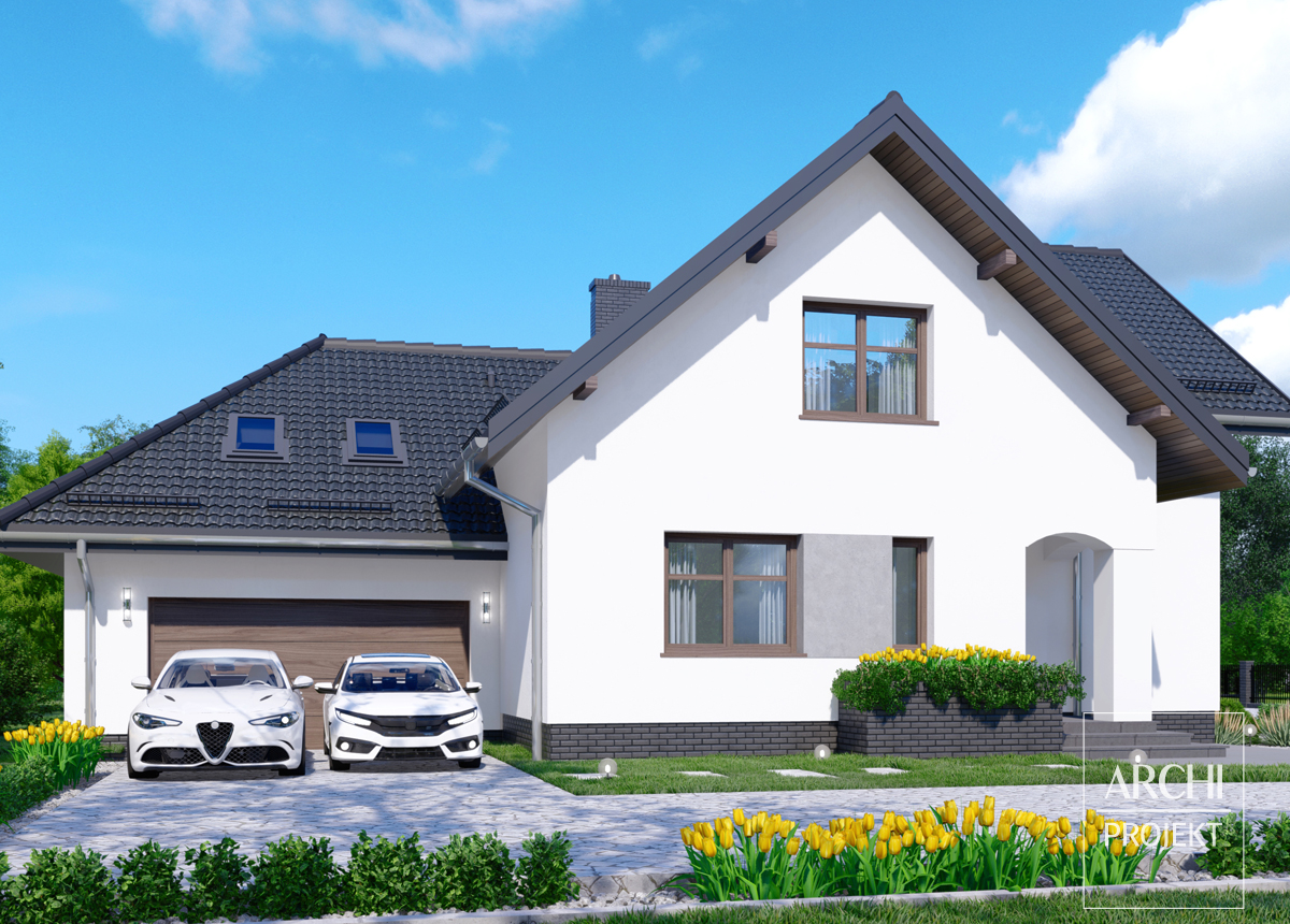 Elegancki dom, o reprezentacyjnej sylwetce i efektownych wnętrzach dla 4-6 osobowej rodziny, z garażem wkomponowanym w bryłę budynku. Układ pomieszczeń pozwala na lokalizację na różnorodnie oświetlonych działkach. Wejście do domu z narożnika - do przedsionka z miejscem na szafę wnękową i dalej do przestronnego hallu. Na parterze: od frontu - atrakcyjnie ukształtowany pokój dzienny z dużą przestrzenią do wypoczynku, obok - otwarta jadalnia, w głębi - także otwarta kuchnia ze spiżarnią, dodatkowy pokój lub gabinet - przy wejściu. Przy przejściu do garażu - nieduża kotłownia Na poddaszu znajdują się: cztery foremne sypialnie, dwie łazienki i duża przestrzeń nad podwójnym garażem możliwa do wykorzystania na cele mieszkalne, rekreacyjne lub pracownię. Możliwe zmiany adaptacyjne: - oddzielenie kuchni i jadalni ścianą z przejściem, - adaptacja strychu nad garażem na pomieszczenie użytkowe, - zwężenie garażu.