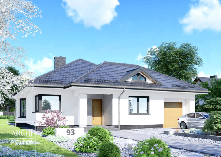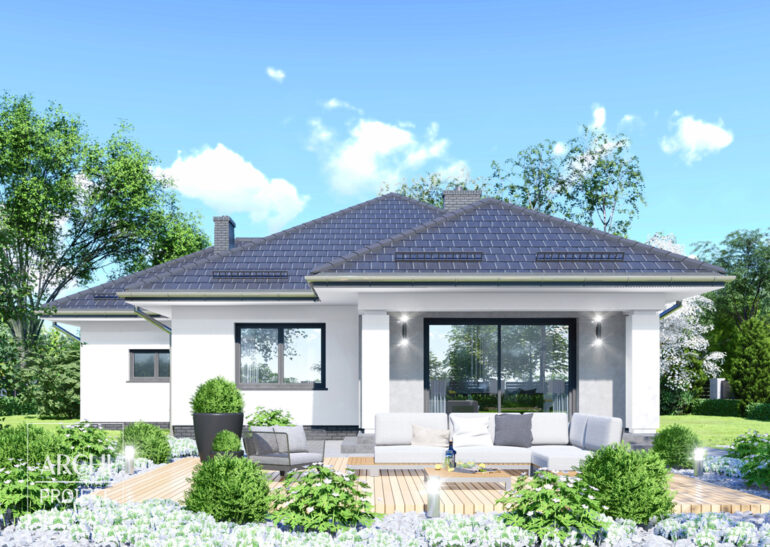 Nowoczesny, zapewniający wygodę, parterowy dom dla 4 osobowej rodziny, z garażem wkomponowanym w bryłę budynku. Wejście do domu, pod zadaszonym podcieniem, prowadzi do przedsionka i dalej do przestronnego hallu łączącego część dzienną i sypialną domu. Od strony frontowej usytuowana jest wygodna kuchnia, posiadająca kącik śniadaniowy i spiżarnię, obok niej - wc. Na wprost wejścia do domu - przestronny, wielofunkcyjny pokój dzienny, z obszerną częścią wypoczynkową, oraz jadalnią w przeszklonym wykuszu. Kontakt z częścią ogrodową zapewniają szerokie trójskrzydłowe drzwi na zadaszony częściowo taras. Wydłużony okap dachu oparty na kolumnach pozwala cieszyć się z pobytu na świeżym powietrzu nawet w deszczową pogodę. Część sypialna zawiera dwie foremne dwuosobowe sypialnie i zgrabną łazienkę. Garaż połączony jest z mieszkaniem poprzez kotłownię, ale w przypadku zastosowania pieca gazowego c.o. można zrezygnować z kotłowni, w celu powiększenia łazienki. Możliwe zmiany adaptacyjne między innymi: - powiększenie pokoju dziennego o część tarasu lub dodanie oranżerii, - poszerzenie garażu na dwustanowiskowy, - adaptacja strychu na pomieszczenia użytkowe, - wykonanie podpiwniczenia i przeniesienie kotłowni.