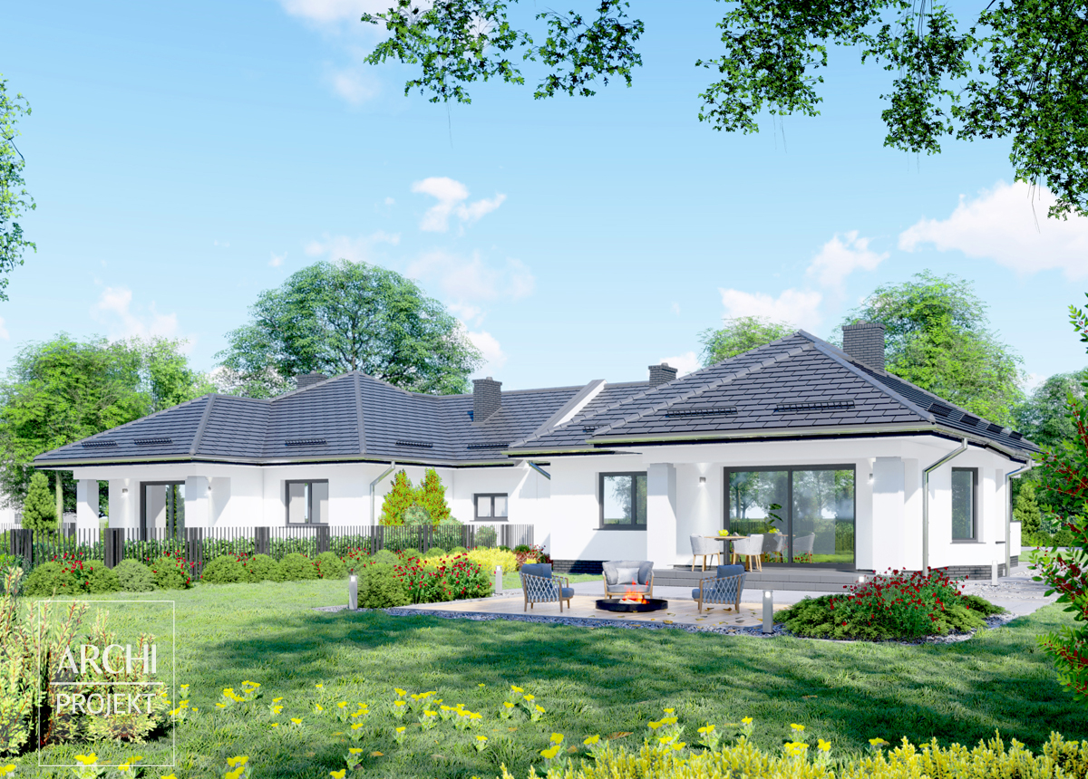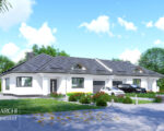 Nowoczesny, zapewniający wygodę, parterowy dom bliźniaczy dla 4 osobowej rodziny, z garażem wkomponowanym w bryłę budynku. Wejście do domu, pod zadaszonym podcieniem, prowadzi do przedsionka i dalej do przestronnego hallu łączącego część dzienną i sypialną domu. Od strony frontowej usytuowana jest wygodna kuchnia, posiadająca kącik śniadaniowy i spiżarnię, obok niej - wc. W głębi domu - przestronny, wielofunkcyjny pokój dzienny, z obszerną częścią wypoczynkową, oraz jadalnią w przeszklonym wykuszu. Kontakt z częścią ogrodową zapewniają szerokie trójskrzydłowe drzwi na zadaszony częściowo taras. Wydłużony okap dachu oparty na kolumnach pozwala cieszyć się z pobytu na świeżym powietrzu nawet w deszczową pogodę. Część sypialna zawiera dwie foremne dwuosobowe sypialnie i zgrabną łazienkę. Garaż połączony jest z mieszkaniem poprzez kotłownię, ale w przypadku zastosowania pieca gazowego c.o. można zrezygnować z kotłowni i powiększyć łazienkę. Możliwe zmiany adaptacyjne m.in.: - powiększenie pokoju dziennego o część tarasu lub dodanie oranżerii, - adaptacja strychu na pomieszczenia użytkowe, - wykonanie podpiwniczenia i przeniesienie kotłowni. Podane powierzchnie dotyczą jednego segmentu. POWYŻSZA CENA DOTYCZY JEDNEGO SEGMENTU