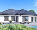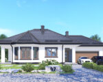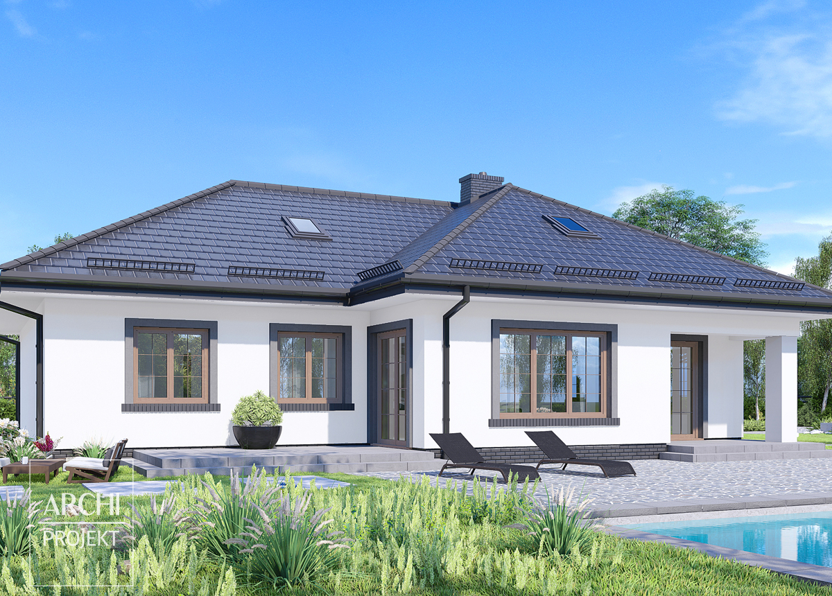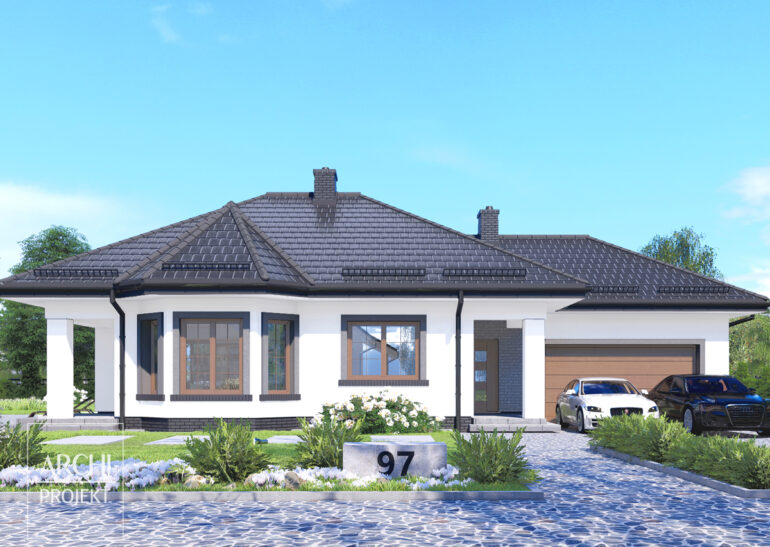 Rozłożysty parterowy dom o układzie funkcjonalnym zapewniającym wygodę i korzystne proporcje między pomieszczeniami, dla 4-5 osobowej rodziny, z garażem dwustanowiskowym. Efektownie rozczłonkowana część frontowa z podcieniami i cofniętą bryłą dużego garażu, kryje nadspodziewanie obszerną część dzienną z okazałym pokojem dziennym z kominkiem, ładną jadalnią z wykuszem od frontu i sąsiadującą z nią kuchnię z widokiem na wejście i dojazd do domu. W takim domu, nawet większe spotkania towarzyskie nie powinny gospodarzom nastręczać trudności. Dom posiada wyjścia z części dziennej na dwa tarasy, dzięki czemu, można go bez trudności lokalizować na różnorodnie oświetlonych i usytuowanych działkach, tak aby w miarę potrzeby można się było odizolować od otoczenia lub hałasu ulicy. Odizolowana część sypialna domu zawiera trzy wygodne sypialnie, dużą łazienkę i schody na strych. Z garażu - przejście do kotłowni. Możliwe zmiany adaptacyjne to między innymi: dodanie w pokoju dziennym wykusza, powiększenie części sypialnej, modyfikacja wymiarów garażu, adaptacja strychu na pomieszczenia użytkowe, wykonanie podpiwniczenia i przeniesienie kotłowni. Zobacz także projekty: APS 097 wersja 2, APS 180+2G.