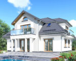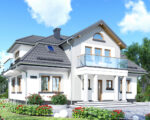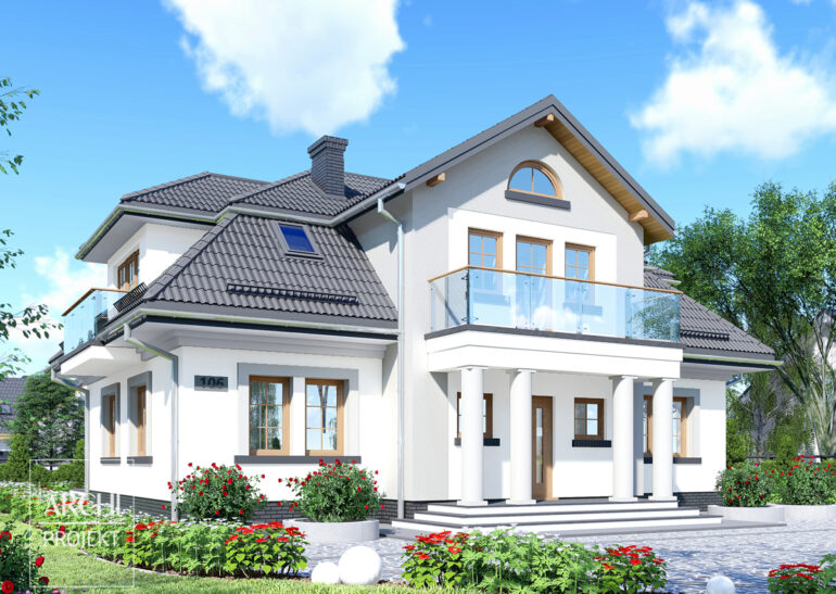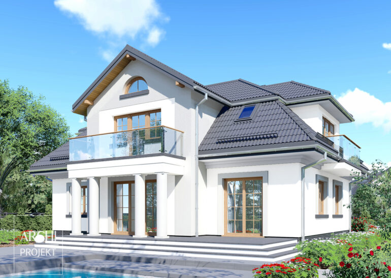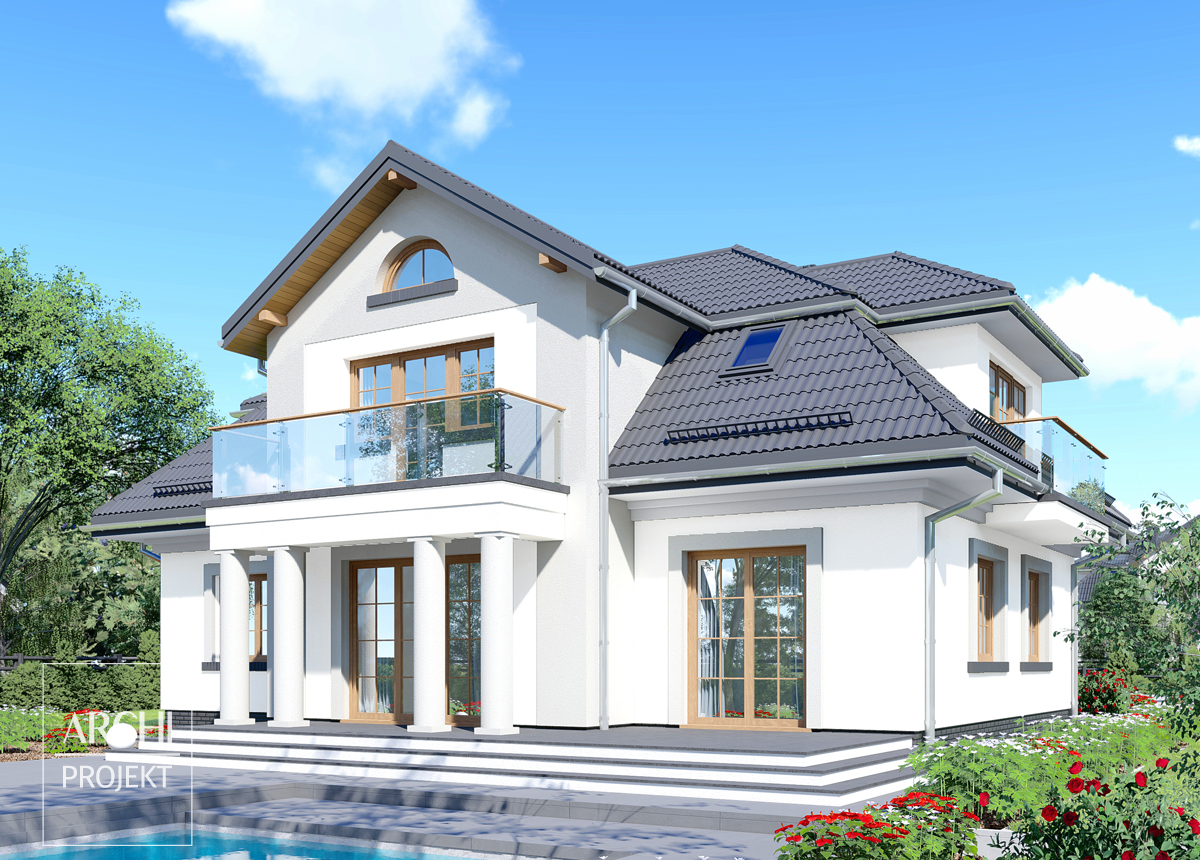 Okazały, reprezentacyjny dom o klasycznej urodzie i wygodnym układzie pomieszczeń dla 5-7 osobowej rodziny. Wejście do domu podkreślone balkonem z kolumnami, prowadzi przez wiatrołap do centralnego hallu. Od frontu znajduje się duża kuchnia, sąsiadująca z równie okazałą jadalnią. Jadalnia tworzy jedno wnętrze z obszernym pokojem dziennym, którego przestronność podkreśla brak zdecydowanego oddzielenia od innych pomieszczeń. Wyjście na taras przez szerokie przeszklone drzwi, ułatwia korzystanie z ogrodu w ciepłych porach roku. Obok - drugi mniejszy pokój gościnny lub gabinet z oddzielną łazienką, może być przewidziany dla starszego pokolenia w rodzinie wielopokoleniowej. Równie obszerne poddasze mieści cztery wygodne sypialnie, każda z garderobą i balkonem, oraz dwie łazienki. Dla osób przyzwyczajonych do tradycyjnego podziału pomieszczeń istnieje możliwość oddzielenia pokoi drzwiami. Możliwe zmiany adaptacyjne: - rozdzielenie ścianami otwartych pomieszczeń na parterze, - wykonanie podpiwniczenia.