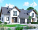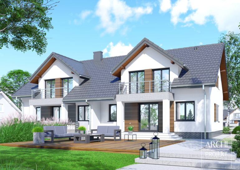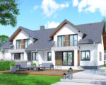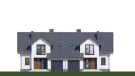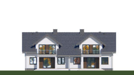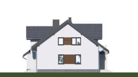 Zgrabny, wygodny dom, o praktycznym układzie pomieszczeń, dla 4-5 osobowej rodziny, z garażem umieszczonym w bryle budynku, pod wydłużonym okapem dachu. Wejście do domu - zaakcentowane podcieniem. Na parterze, na wprost wejścia znajduje się pokój dzienny z wyjściem na osłonięty szerokim balkonem taras. Obok pokoju otwarta kuchnia z częścią jadalną na styku z pokojem dziennym. Na parterze także: łazienka i kotłownia, oraz garaż w poziomie terenu. Część sypialna na poddaszu składa się z trzech sypialni, garderoby i dużej łazienki. Możliwe zmiany adaptacyjne: - powiększenie pokoju dziennego o wykusz pod balkonem, - adaptacja pomieszczenia po kotłowni na dodatkowy pokój, po jej likwidacji i przeniesieniu pieca gazowego c.o. do łazienki, - wydzielenie z powierzchni sypialni garderoby.