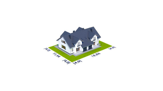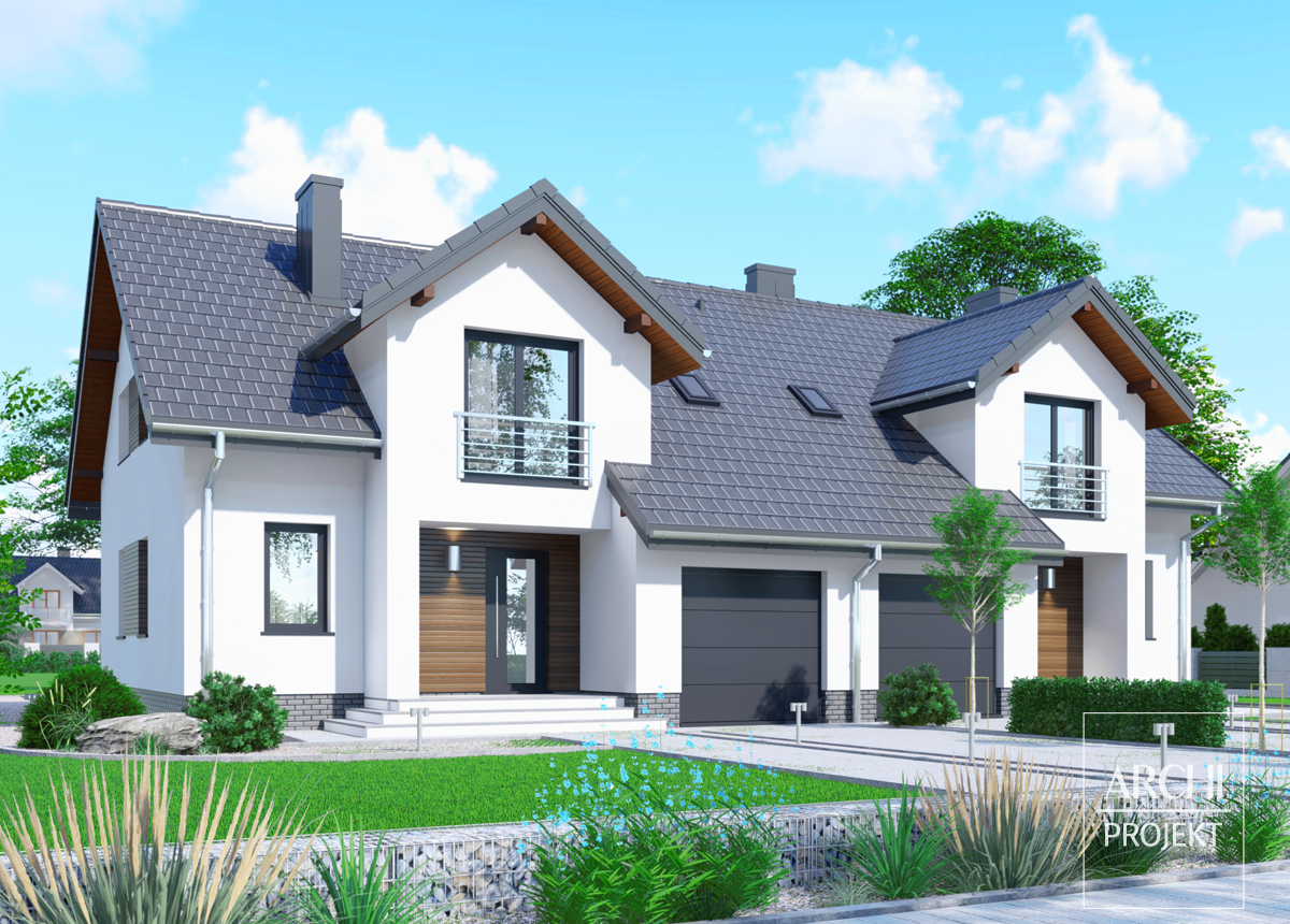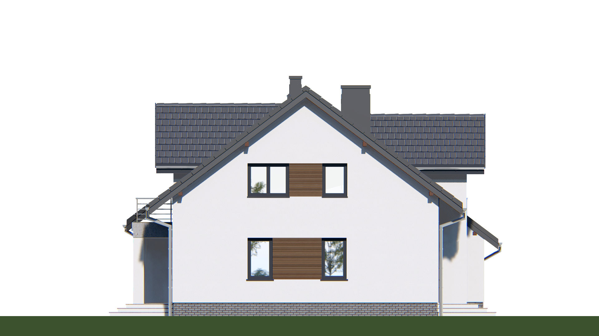 Zgrabny, wygodny dom, o praktycznym układzie pomieszczeń, dla 4-5 osobowej rodziny, z garażem umieszczonym w bryle budynku, pod wydłużonym okapem dachu. Wejście do domu - zaakcentowane podcieniem. Na parterze, na wprost wejścia znajduje się pokój dzienny z wyjściem na osłonięty szerokim balkonem taras. Obok pokoju otwarta kuchnia z częścią jadalną na styku z pokojem dziennym. Na parterze także: łazienka i kotłownia, oraz garaż w poziomie terenu. Część sypialna na poddaszu składa się z trzech sypialni, garderoby i dużej łazienki. Możliwe zmiany adaptacyjne: - powiększenie pokoju dziennego o wykusz pod balkonem, - adaptacja pomieszczenia po kotłowni na dodatkowy pokój, po jej likwidacji i przeniesieniu pieca gazowego c.o. do łazienki, - wydzielenie z powierzchni sypialni garderoby.