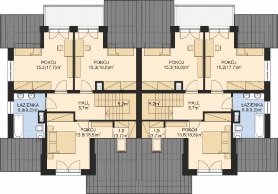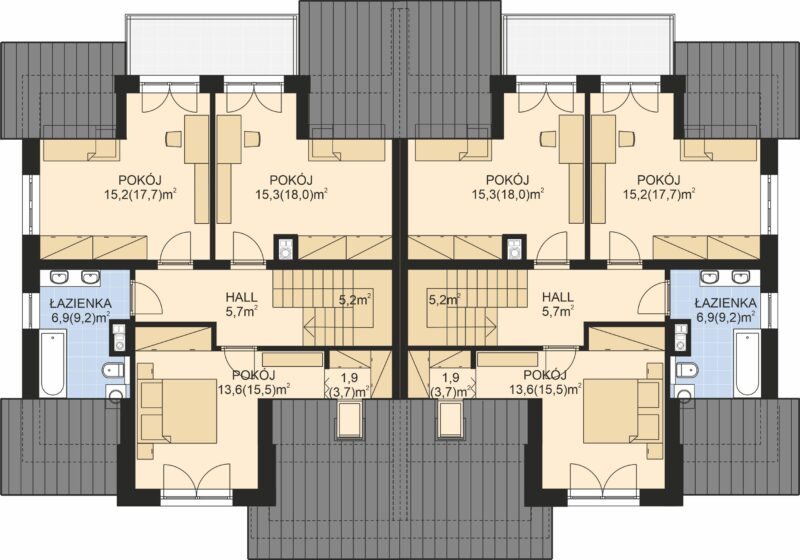 duża łazienka z miejscem na prysznic i kotłownia tuż przy wejściu. Część sypialna domu znajduje się na poddaszu i składa się z trzech obszernych sypialni, jedna z nich z garderobą. Duża łazienka pomieści wannę i prysznic, można z niej wydzielić osobną pralnię w głębi pomieszczenia.