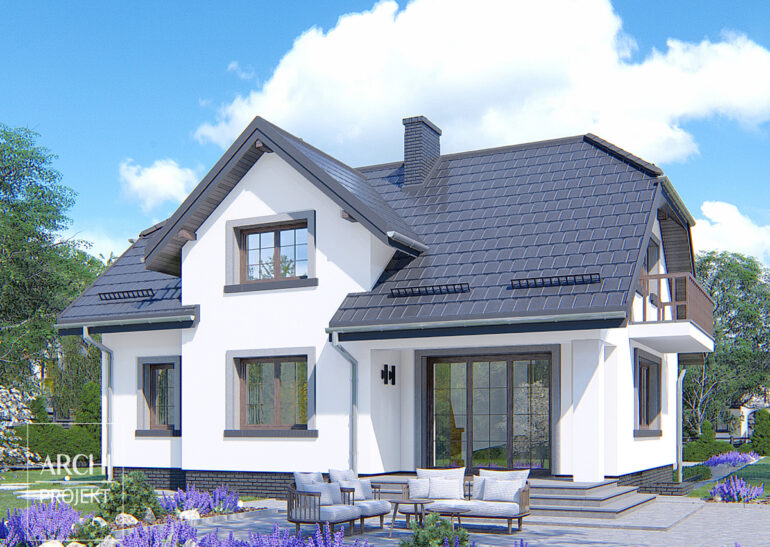 Funkcjonalny dom o harmonijnej sylwetce, szczególnie nadający się na działki ze spadkiem terenu, dla 4-6 osobowej rodziny. Zarówno w pokoju dziennym, zajmującym całą głębokość domu, jak i w pokoju gościnnym od frontu, nie powinno zabraknąć miejsca dla nikogo z użytkowników. Takie usytuowanie pokoju dziennego ułatwia zlokalizowanie domu na różnorodnie zorientowanych względem stron świata działkach. Kuchnia dzięki swoim gabarytom może stanowić centrum życia rodzinnego. Znajdujące się na poddaszu trzy sypialnie z garderobami i duża łazienka z pralnią zapewnią komfort nawet mieszkańcom o dużych wymaganiach. W piwnicy: garaż, kotłownia i pom. gospodarcze. Możliwe zmiany adaptacyjne między innymi: - powiększenie pokoju dziennego w stronę tarasu i połączenie kuchni z jadalnią, - likwidacja piwnicy i przeniesienie pieca gazowego c.o. do spiżarni lub łazienki.