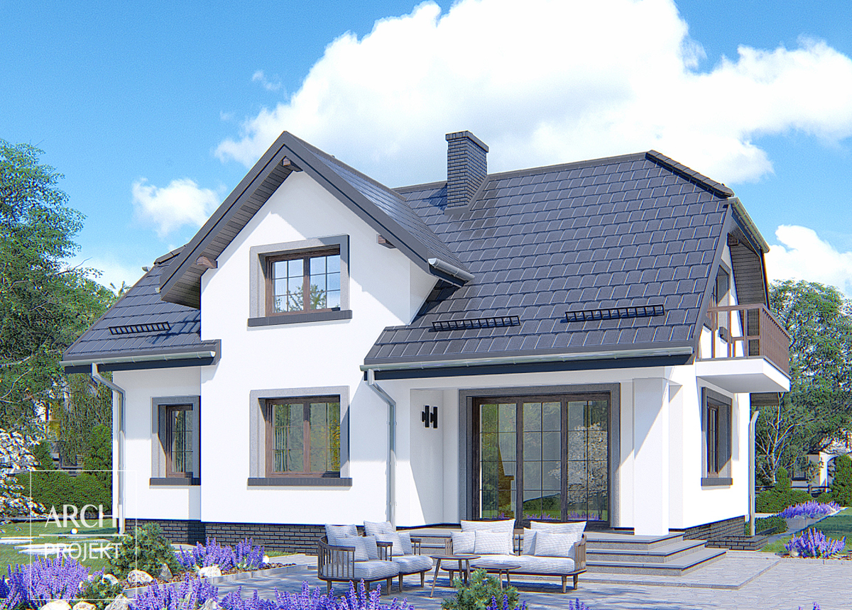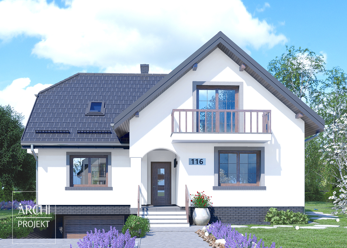 Funkcjonalny dom o harmonijnej sylwetce, szczególnie nadający się na działki ze spadkiem terenu, dla 4-6 osobowej rodziny. Zarówno w pokoju dziennym, zajmującym całą głębokość domu, jak i w pokoju gościnnym od frontu, nie powinno zabraknąć miejsca dla nikogo z użytkowników. Takie usytuowanie pokoju dziennego ułatwia zlokalizowanie domu na różnorodnie zorientowanych względem stron świata działkach. Kuchnia dzięki swoim gabarytom może stanowić centrum życia rodzinnego. Znajdujące się na poddaszu trzy sypialnie z garderobami i duża łazienka z pralnią zapewnią komfort nawet mieszkańcom o dużych wymaganiach. W piwnicy: garaż, kotłownia i pom. gospodarcze. Możliwe zmiany adaptacyjne między innymi: - powiększenie pokoju dziennego w stronę tarasu i połączenie kuchni z jadalnią, - likwidacja piwnicy i przeniesienie pieca gazowego c.o. do spiżarni lub łazienki.
