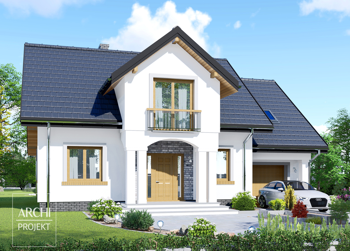 Nowoczesny i wygodny dom o praktycznym układzie pomieszczeń, przeznaczony dla 4-6 osobowej rodziny. Wejście do domu zaakcentowane łukowym podcieniem prowadzi do przedsionka na tyle obszernego, że może być równocześnie garderobą. Część dzienna domu składa się z obszernego salonu z narożnym kominkiem i efektownym wykuszem, kuchni ze spiżarnią i drugiego pokoju od strony frontowej. Poddasze zawiera: trzy obszerne sypialnie, łazienkę i garderobę. Uzupełnieniem części sypialnej na poddaszu jest duże pomieszczenie na półpiętrze nad garażem, możliwe także do adaptacji na pomieszczenie użytkowe. Poszerzenie garażu na dwustanowiskowy nie stanowi problemu technicznego. Możliwe zmiany adaptacyjne: - adaptacja strychu na pokój lub pomieszczenie rekreacyjne, - wydzielenie garderoby z powierzchni sypialni, - wykonanie podpiwniczenia. Zobacz także projekty: APS 183, APS 177.