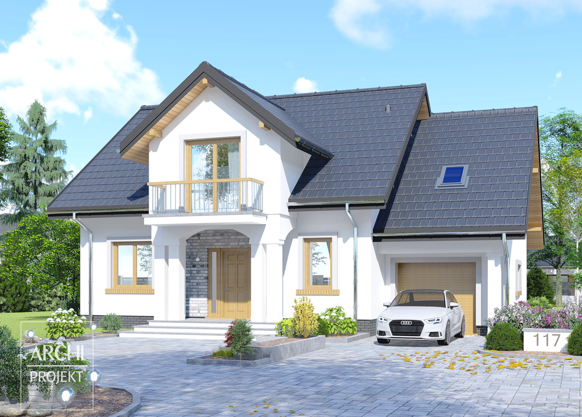 Nowoczesny i wygodny dom o praktycznym układzie pomieszczeń, przeznaczony dla 4-6 osobowej rodziny. Wejście do domu zaakcentowane łukowym podcieniem prowadzi do przedsionka na tyle obszernego, że może być równocześnie garderobą. Część dzienna domu składa się z obszernego salonu z narożnym kominkiem i efektownym wykuszem, kuchni ze spiżarnią i drugiego pokoju od strony frontowej. Poddasze zawiera: trzy obszerne sypialnie, łazienkę i garderobę. Uzupełnieniem części sypialnej na poddaszu jest duże pomieszczenie na półpiętrze nad garażem, możliwe także do adaptacji na pomieszczenie użytkowe. Poszerzenie garażu na dwustanowiskowy nie stanowi problemu technicznego. Możliwe zmiany adaptacyjne: - adaptacja strychu na pokój lub pomieszczenie rekreacyjne, - wydzielenie garderoby z powierzchni sypialni, - wykonanie podpiwniczenia. Zobacz także projekty: APS 183, APS 177.