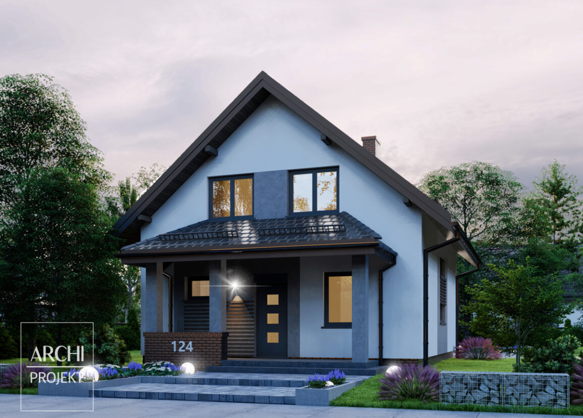 Praktyczny dom o nieskomplikowanej konstrukcji i spokojnej sylwetce dla 4-5 osobowej rodziny, możliwy do realizacji stosunkowo niedużym nakładem środków. Wejście do domu, osłonięte opartym na filarach dachem, praktycznym w naszym klimacie, prowadzi do przedsionka i dalej do hallu. Od frontu - pokój gościnny lub gabinet, naprzeciw - łazienka z piecem c.o. Usytuowana jest w głębi domu część dzienna składa się z funkcjonalnego pokoju dziennego tworzącego z jadalnią i kuchnią jedną przestrzeń. Szeroki taras osłonięty jest balkonem. Część sypialna na poddaszu zawiera: dwie dwuosobowe sypialnie i dużą łazienkę. Istnieje możliwość zaprojektowania podpiwniczenia. Dostępna jest także wersja domu z garażem - APS 124+G. Możliwe zmiany adaptacyjne: - powiększenie pokoju dziennego poprzez wykonanie wykusza, - wykonanie podpiwniczenia.