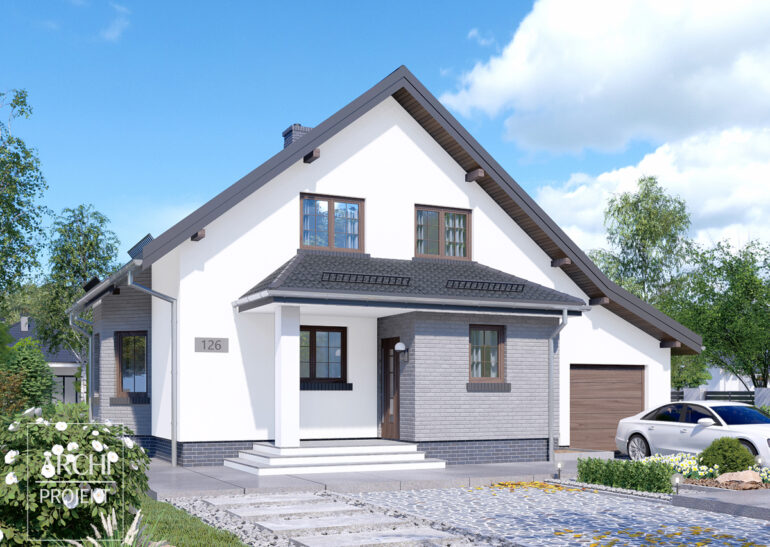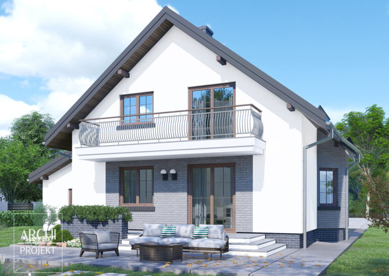 Ekonomiczny dom, łączący prostotę sylwetki o dobrych proporcjach z praktycznością wnętrza, cechami tak poszukiwanymi przez wielu inwestorów. Osłonięte dachem wejście sprawdza się w naszym klimacie, a okno w kuchni z widokiem na wejście do domu, pozwala widzieć przychodzących gości. Przy wejściu - mała łazienka, oraz kotłownia. W głębi domu - obszerna część dzienna, powiększona dzięki wykuszowi w jadalni. Szeroki taras od strony ogrodowej jest jedną z wielu zalet tego domu. Obok schodów - dodatkowy pokój lub gabinet. Część sypialna na poddaszu z trzema foremnymi sypialniami, garderobami i wydzielonym wc będzie się podobać przyszłym mieszkańcom. Na mniejszych działkach możliwa jest także budowa tego domu bez garażu. Możliwe zmiany adaptacyjne: - wydzielenie z kuchni niewielkiej spiżarni, - likwidacja garażu, - wykonanie podpiwniczenia.