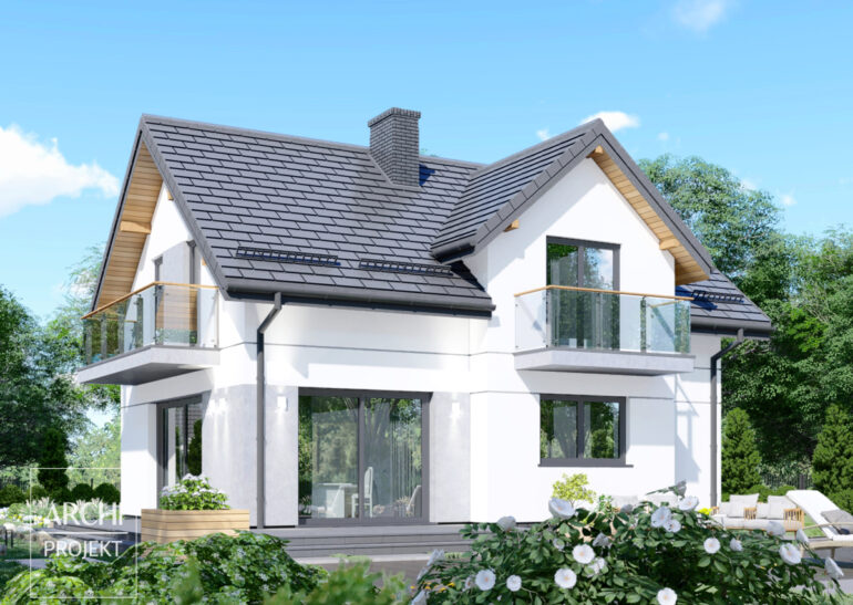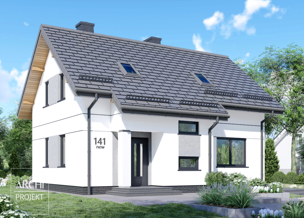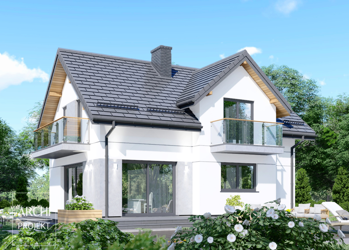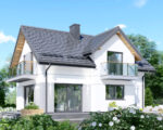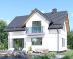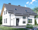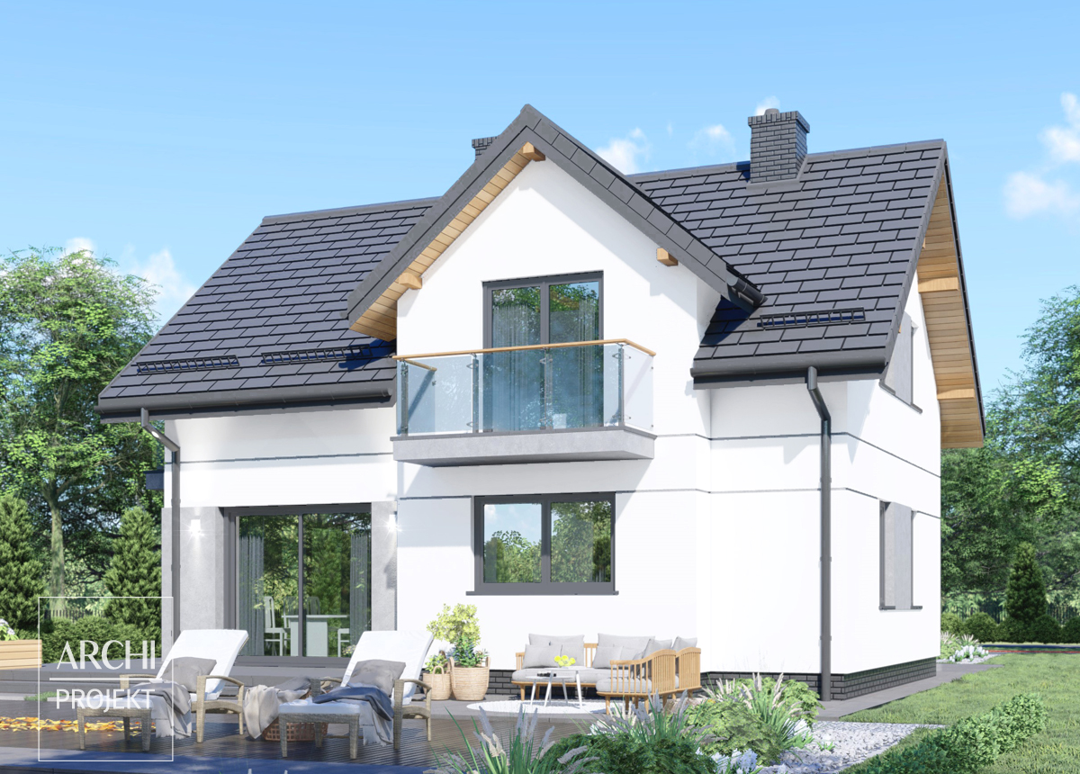 Nowoczesny, praktyczny dom o zwartej, proporcjonalnej sylwetce zaprojektowany dla 4 osobowej rodziny. Dzięki usytuowaniu pokoju dziennego, który zajmuje całą głębokość budynku, możliwe jest lokalizowanie domu na różnorodnie zorientowanych względem stron świata działkach. Wejście do domu osłonięte podcieniem i prowadzi do obszernego wiatrołapu łączącego funkcję przedsionka i garderoby. Część dzienna składa się z obszernego pokoju dziennego połączonego z otwartą klatką schodową, oraz z przestronnej kuchni zawierającej kącik jadalny i przejście do kotłowni, która może być także schowkiem-spiżarnią. Na poddaszu znajdują się trzy sypialnie, garderoba i wygodna łazienka. Możliwe jest dodanie garażu przy ścianie domu i wykonanie podpiwniczenia.