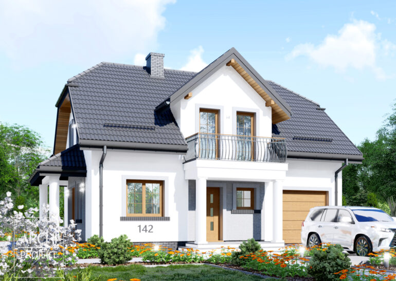 Stylowy dom o eleganckiej sylwetce i efektownym wnętrzu dla 4 osobowej rodziny, z garażem wkomponowanym w bryłę domu. Fronton z kolumnami dodaje domowi elegancji, ale jest też praktyczny, osłaniając wejście do domu. Od strony frontowej znajduje się kuchnia, naprzeciw mała łazienka. Ozdobą tego domu jest zlokalizowany w głębi obszerny pokój dzienny z wykuszem i klatką schodową, połączoną przestrzennie z pokojem. Przy przejściu do kuchni - kominek. Na parterze znajdują się także: garaż i kotłownia z drzwiami na zewnątrz. Na poddaszu usytuowane są: trzy duże sypialnie z miejscem na szafy wnękowe, funkcjonalna łazienka i pralnia. Wielkość sypialni na pewno znajdzie uznanie u tych, którzy używają tych pokoi nie tylko do snu, ale też do pracy czy nauki. Możliwe zmiany adaptacyjne to między innymi: - powiększenie tarasu na narożnik domu, - likwidacja garażu z przeznaczeniem na dodatkowy pokój, - wykonanie podpiwniczenia.