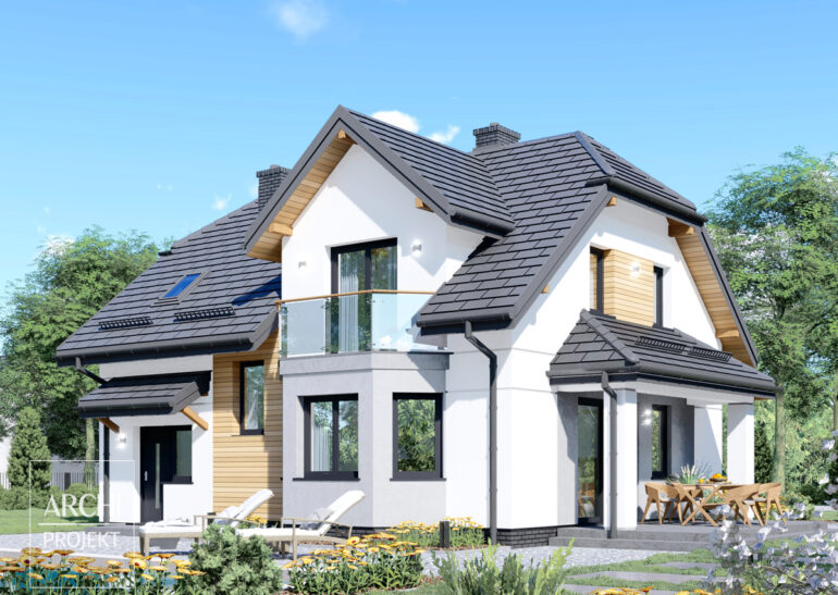 Funkcjonalny dom o nowoczesnej stylizacji i efektownym wnętrzu dla 4 osobowej rodziny, z garażem wkomponowanym w bryłę domu. Fronton z kolumnami dodaje domowi elegancji, ale jest też praktyczny, osłaniając wejście do domu. Od strony frontowej znajduje się kuchnia, naprzeciw mała łazienka. Ozdobą tego domu jest zlokalizowany w głębi obszerny pokój dzienny z wykuszem i klatką schodową, połączoną przestrzennie z pokojem. Przy przejściu do kuchni - kominek. Na parterze znajdują się także: garaż i kotłownia z drzwiami na zewnątrz. Na poddaszu usytuowane są: trzy duże sypialnie z miejscem na szafy wnękowe, funkcjonalna łazienka i pralnia. Wielkość sypialni na pewno znajdzie uznanie u tych, którzy używają tych pokoi nie tylko do snu, ale też do pracy czy nauki. Możliwe zmiany adaptacyjne: - powiększenie tarasu na narożnik domu, - likwidacja garażu z przeznaczeniem na dodatkowy pokój, - wykonanie podpiwniczenia.