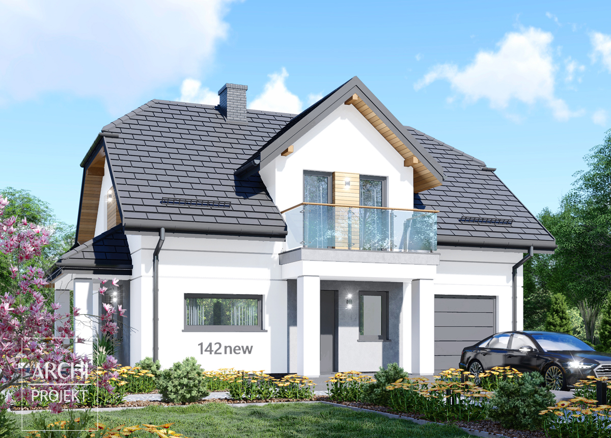 Funkcjonalny dom o nowoczesnej stylizacji i efektownym wnętrzu dla 4 osobowej rodziny, z garażem wkomponowanym w bryłę domu. Fronton z kolumnami dodaje domowi elegancji, ale jest też praktyczny, osłaniając wejście do domu. Od strony frontowej znajduje się kuchnia, naprzeciw mała łazienka. Ozdobą tego domu jest zlokalizowany w głębi obszerny pokój dzienny z wykuszem i klatką schodową, połączoną przestrzennie z pokojem. Przy przejściu do kuchni - kominek. Na parterze znajdują się także: garaż i kotłownia z drzwiami na zewnątrz. Na poddaszu usytuowane są: trzy duże sypialnie z miejscem na szafy wnękowe, funkcjonalna łazienka i pralnia. Wielkość sypialni na pewno znajdzie uznanie u tych, którzy używają tych pokoi nie tylko do snu, ale też do pracy czy nauki. Możliwe zmiany adaptacyjne: - powiększenie tarasu na narożnik domu, - likwidacja garażu z przeznaczeniem na dodatkowy pokój, - wykonanie podpiwniczenia.