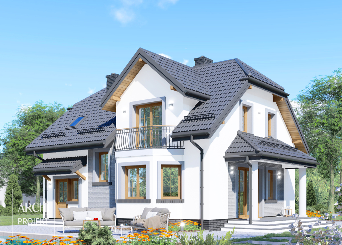 Stylowy dom o eleganckiej sylwetce i efektownym wnętrzu dla 4 osobowej rodziny, z garażem wkomponowanym w bryłę domu. Fronton z kolumnami dodaje domowi elegancji, ale jest też praktyczny, osłaniając wejście do domu. Od strony frontowej znajduje się kuchnia, naprzeciw mała łazienka. Ozdobą tego domu jest zlokalizowany w głębi obszerny pokój dzienny z wykuszem i klatką schodową, połączoną przestrzennie z pokojem. Przy przejściu do kuchni - kominek. Na parterze znajdują się także: garaż i kotłownia z drzwiami na zewnątrz. Na poddaszu usytuowane są: trzy duże sypialnie z miejscem na szafy wnękowe, funkcjonalna łazienka i pralnia. Wielkość sypialni na pewno znajdzie uznanie u tych, którzy używają tych pokoi nie tylko do snu, ale też do pracy czy nauki. Możliwe zmiany adaptacyjne to między innymi: - powiększenie tarasu na narożnik domu, - likwidacja garażu z przeznaczeniem na dodatkowy pokój, - wykonanie podpiwniczenia.