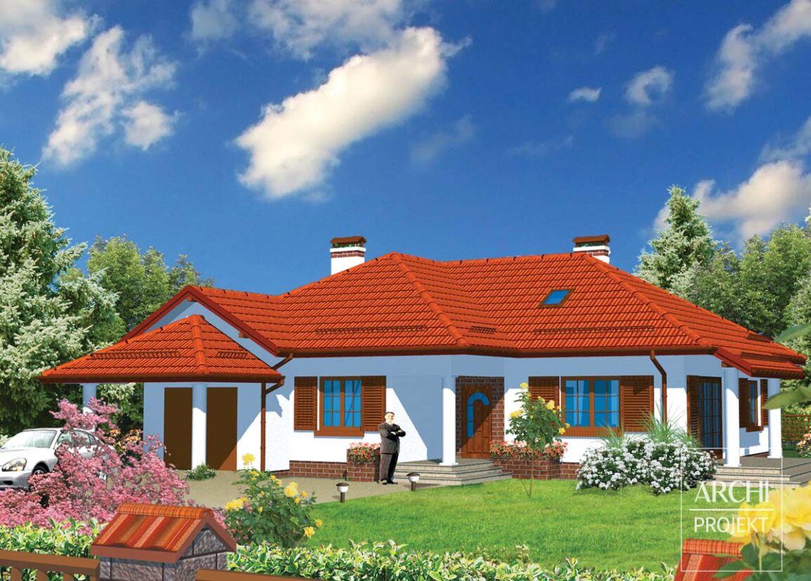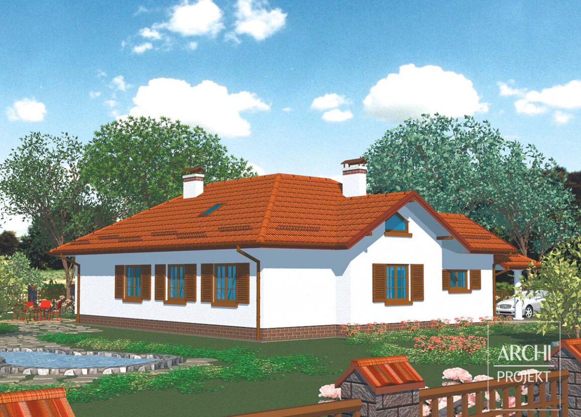 Obszerny parterowy dom dla 4 osobowej rodziny, z garażem jednostanowiskowym wkomponowanym w bryłę domu. Układ funkcjonalny pozwala na lokalizację domu na różnorodnie zorientowanych względem stron świata działkach. Wejście do domu, osłonięte zadaszonym podcieniem, prowadzi do przedsionka i dalej do części dziennej domu łączącej przestrzeń hallu, pokoju dziennego i jadalni. Kuchnia, sąsiadująca z jadalnią, oddzielona jest optycznie od salonu ścianą z kominkiem. Zadaszony taras może być w ciepłych porach roku, przedłużeniem salonu, ułatwiają to szerokie przeszklone drzwi. Część sypialna, usytuowana w głębi domu składa się z trzech sypialni i łazienki. Pod schodami na strych - wc. Kotłownia, umieszczona za łazienką może również pełnić funkcję pralni. Możliwe zmiany adaptacyjne: - powiększenie pokoju dziennego o wykusz, - adaptacja strychu na pomieszczenia użytkowe, - wykonanie podpiwniczenia i przeniesienie kotłowni, - powiększenie części sypialnej po przeniesieniu kotłowni do piwnicy.