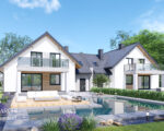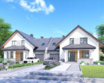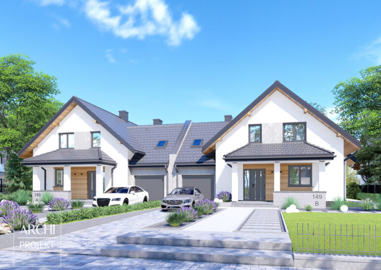 Nowoczesna wersja popularnego bliźniaka APS 149. Wygodny dom bliźniaczy o nowoczesnej sylwetce i funkcjonalnym układzie pomieszczeń dla 4-6 osobowej rodziny, z garażem wkomponowanym w bryłę domu. Wejście do domu, osłonięte praktycznym podcieniem, prowadzi do przedsionka z miejscem na szafę ubraniową i szafki na buty. Duża kuchnia (ze stolikiem śniadaniowym i spiżarnią), usytuowana jest od strony frontowej, sąsiaduje z pokojem dziennym. Znajdujący się w głębi domu obszerny pokój dzienny zawiera część jadalną i wypoczynkową. Kominek może być wykorzystywany w chłodniejszych okresach roku. Taras od strony ogrodowej osłonięty jest szerokim balkonem, co pomaga uniezależnić jego użytkowanie od pogody. Na parterze znajdują się także: drugi mniejszy pokój i łazienka. Poddasze posiada trzy wygodne sypialnie, garderobę i dużą łazienkę. Za garażem, usytuowanym w poziomie terenu znajduje się kotłownia. Nad garażem duże pomieszczenie możliwe do adaptacji na dodatkowy pokój lub pomieszczenie rekreacyjne. Możliwe jest także poszerzenie garażu na dwustanowiskowy i wykonanie podpiwniczenia. Zobacz także projekty: APS 91 NEW, APS 149, APS 192, APS 209, APS 237. POWYŻSZA CENA DOTYCZY JEDNEGO SEGMENTU