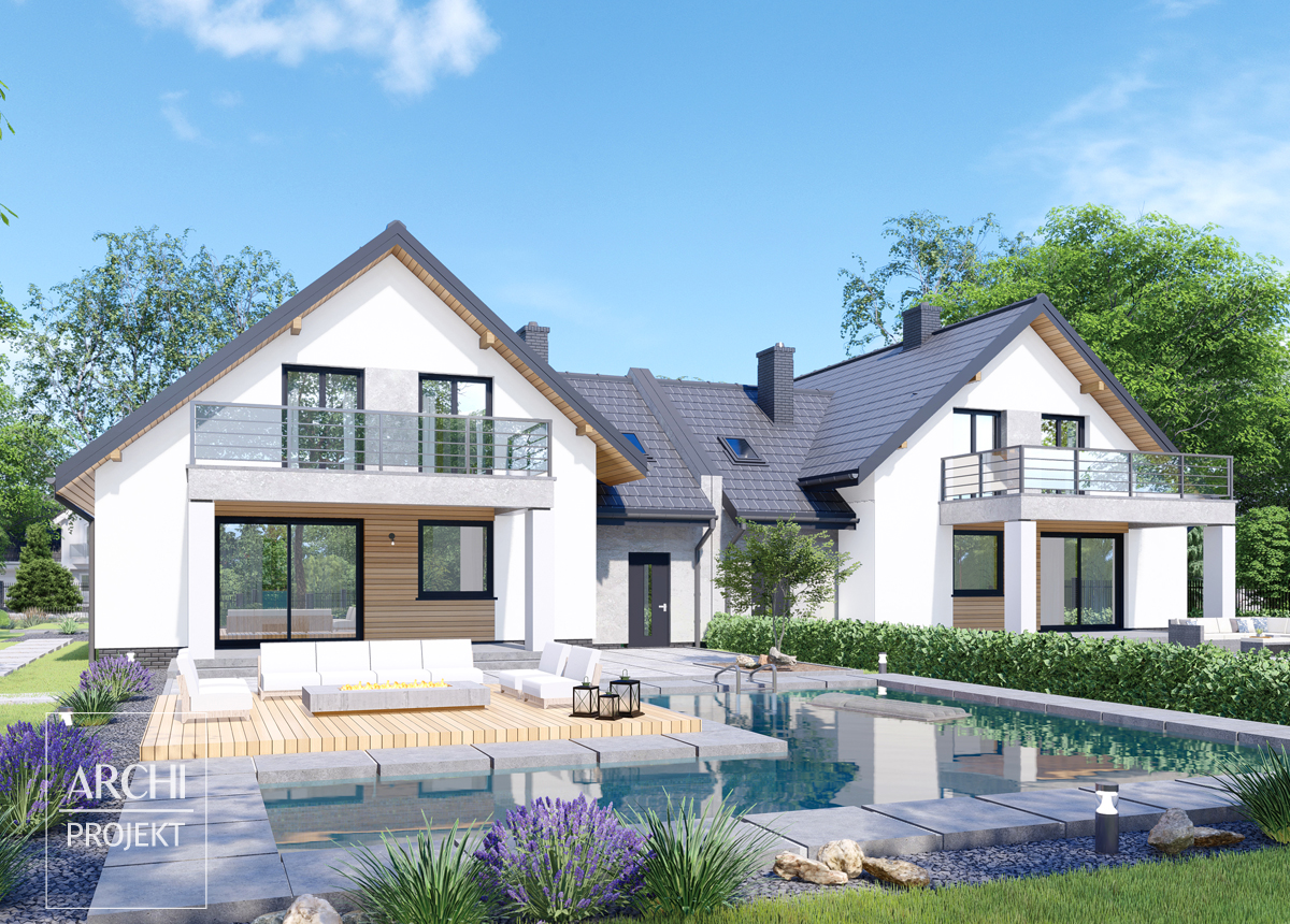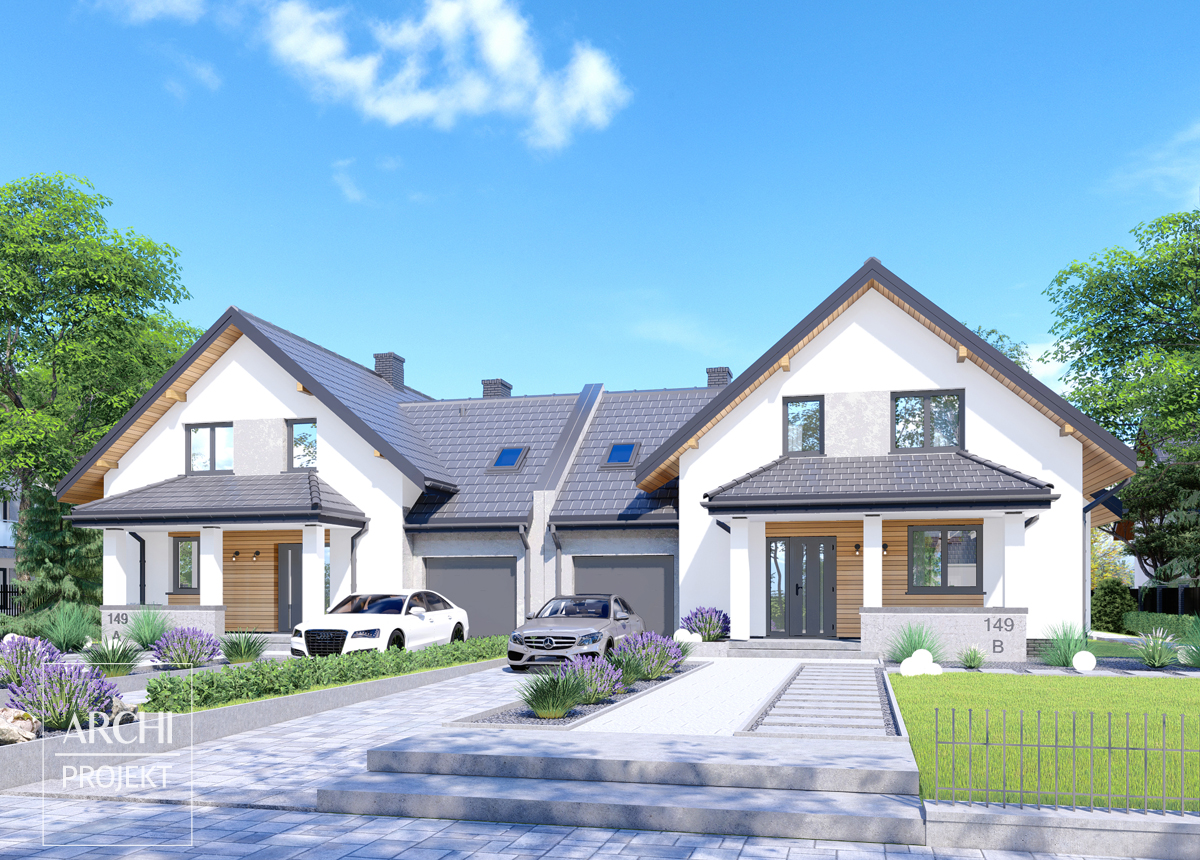 Nowoczesna wersja popularnego bliźniaka APS 149. Wygodny dom bliźniaczy o nowoczesnej sylwetce i funkcjonalnym układzie pomieszczeń dla 4-6 osobowej rodziny, z garażem wkomponowanym w bryłę domu. Wejście do domu, osłonięte praktycznym podcieniem, prowadzi do przedsionka z miejscem na szafę ubraniową i szafki na buty. Duża kuchnia (ze stolikiem śniadaniowym i spiżarnią), usytuowana jest od strony frontowej, sąsiaduje z pokojem dziennym. Znajdujący się w głębi domu obszerny pokój dzienny zawiera część jadalną i wypoczynkową. Kominek może być wykorzystywany w chłodniejszych okresach roku. Taras od strony ogrodowej osłonięty jest szerokim balkonem, co pomaga uniezależnić jego użytkowanie od pogody. Na parterze znajdują się także: drugi mniejszy pokój i łazienka. Poddasze posiada trzy wygodne sypialnie, garderobę i dużą łazienkę. Za garażem, usytuowanym w poziomie terenu znajduje się kotłownia. Nad garażem duże pomieszczenie możliwe do adaptacji na dodatkowy pokój lub pomieszczenie rekreacyjne. Możliwe jest także poszerzenie garażu na dwustanowiskowy i wykonanie podpiwniczenia. Zobacz także projekty: APS 91 NEW, APS 149, APS 192, APS 209, APS 237. POWYŻSZA CENA DOTYCZY JEDNEGO SEGMENTU