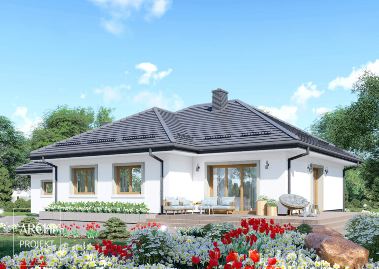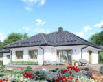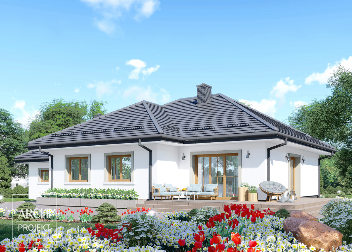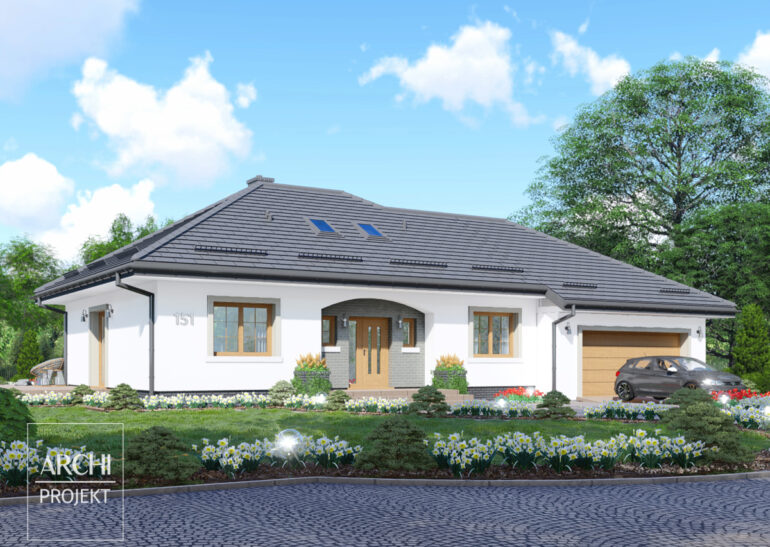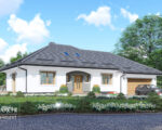Elegancki dom o zgrabnej sylwetce i układzie pomieszczeń zapewniającym mieszkańcom duży komfort. Obszerny dom dla 4 osobowej rodziny, z dwustanowiskowym garażem wkomponowanym w bryłę budynku. Wejście do domu, osłonięte łukowym podcieniem, prowadzi do przedsionka i dalej do centralnie usytuowanego hallu. W hallu miejsce na dużą szafę wnękową. Usytuowana od frontu kuchnia posiada wydzieloną spiżarnię, oraz połączenie ze znajdującym się w głębi domu obszernym pokojem dziennym, którego część jadalna sąsiaduje bezpośrednio z kuchnią. Na szerszych działkach możliwe jest powiększenie jadalni o wykusz, co wzbogaci również bryłę domu. Część wypoczynkowa pokoju dziennego zawiera kominek i wyjście na obszerny taras. Część sypialna zawiera trzy wygodne sypialnie, garderobę i komfortowo wyposażoną łazienkę. Pokój przy wejściu do domu może pełnić także funkcję gabinetu. Pod schodami na poddasze znajduje się przejście do części gospodarczej i dwustanowiskowego garażu. Możliwa jest adaptacja poddasza na pomieszczenia mieszkalne.