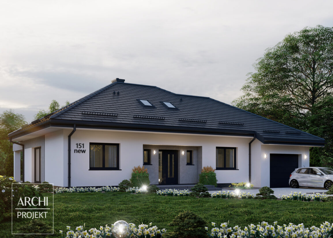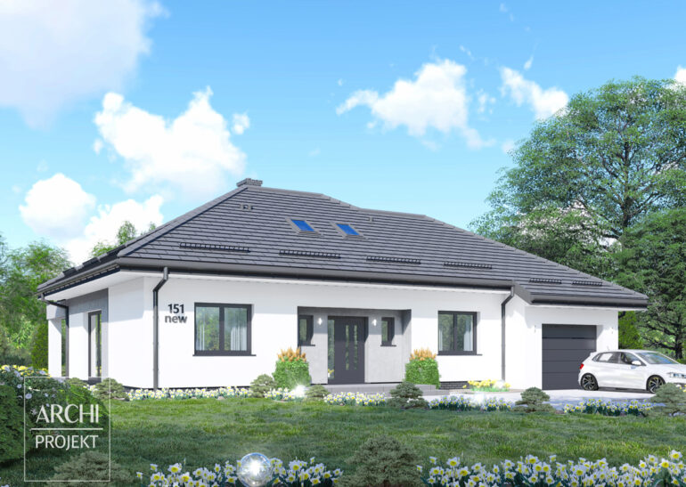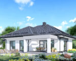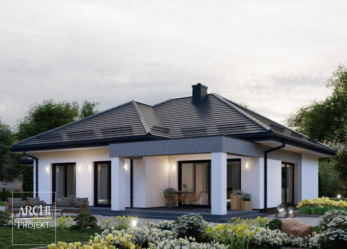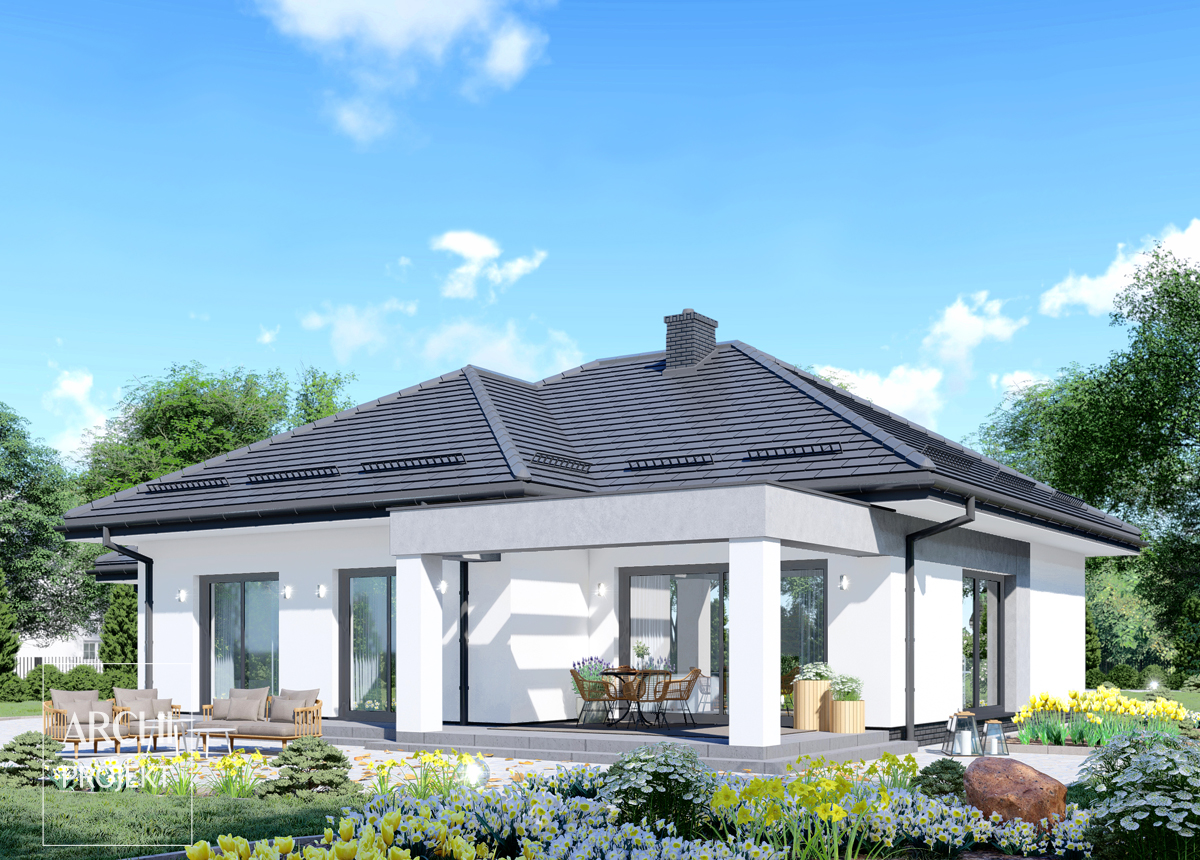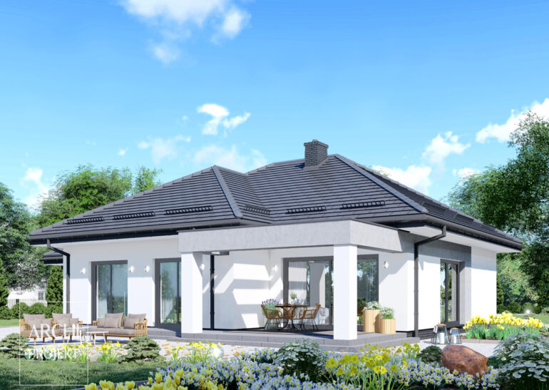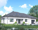 Elegancki dom o zgrabnej sylwetce i układzie pomieszczeń zapewniającym mieszkańcom duży komfort. Obszerny dom dla 4 osobowej rodziny, z garażem wkomponowanym w bryłę budynku. Wejście do domu, osłonięte łukowym podcieniem, prowadzi do przedsionka i dalej do centralnie usytuowanego hallu. W hallu miejsce na dużą szafę wnękową. Usytuowana od frontu kuchnia posiada wydzieloną spiżarnię, oraz połączenie ze znajdującym się w głębi domu obszernym pokojem dziennym, którego część jadalna sąsiaduje bezpośrednio z kuchnią. Na szerszych działkach możliwe jest powiększenie jadalni o wykusz, co wzbogaci również bryłę domu. Część wypoczynkowa pokoju dziennego zawiera kominek i wyjście na obszerny taras. Część sypialna zawiera trzy wygodne sypialnie, garderobę i komfortowo wyposażoną łazienkę. Pokój przy wejściu do domu może pełnić także funkcję gabinetu. Pod schodami na poddasze znajduje się przejście do części gospodarczej i garażu. Możliwe zmiany adaptacyjne to między innymi: - powiększenie jadalni o wykusz, - poszerzenie garażu na dwustanowiskowy, - adaptacja strychu na pomieszczenia użytkowe.