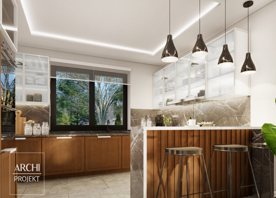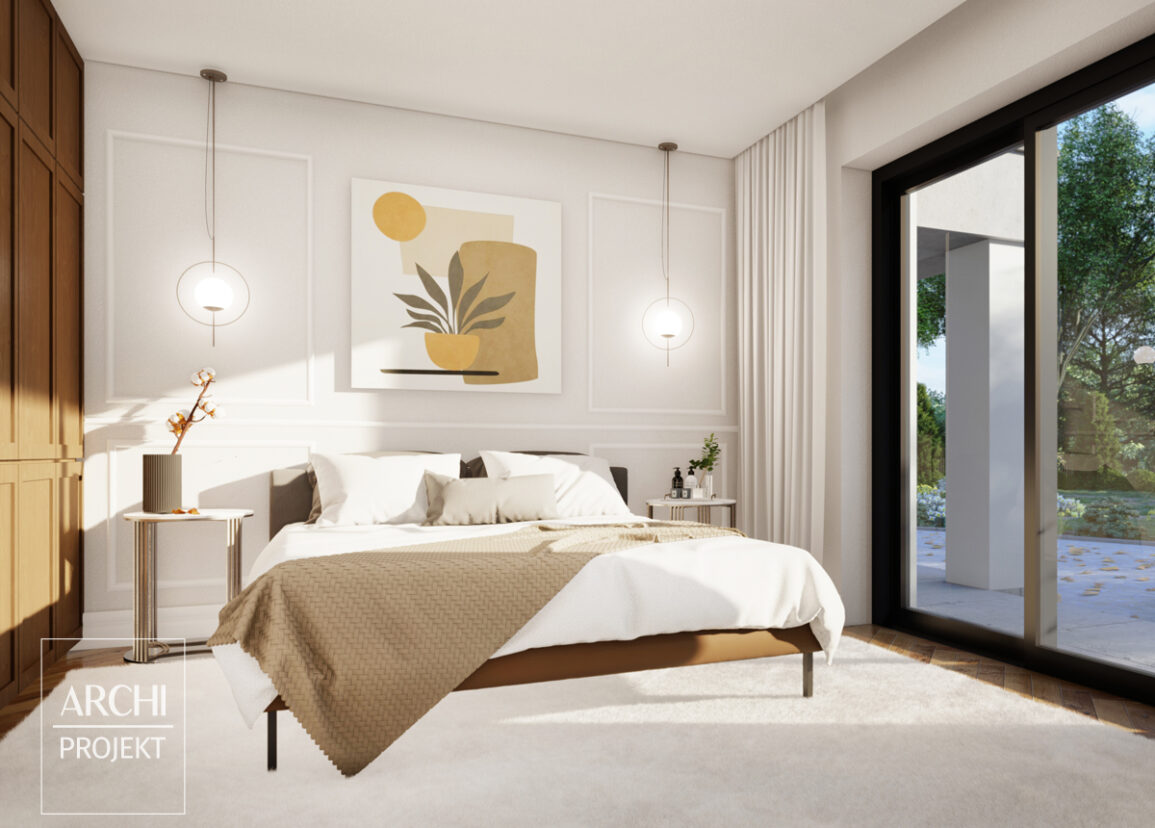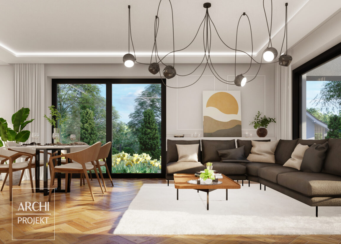 Elegancki dom o zgrabnej sylwetce i układzie pomieszczeń zapewniającym mieszkańcom duży komfort. Obszerny dom dla 4 osobowej rodziny, z garażem wkomponowanym w bryłę budynku. Wejście do domu, osłonięte łukowym podcieniem, prowadzi do przedsionka i dalej do centralnie usytuowanego hallu. W hallu miejsce na dużą szafę wnękową. Usytuowana od frontu kuchnia posiada wydzieloną spiżarnię, oraz połączenie ze znajdującym się w głębi domu obszernym pokojem dziennym, którego część jadalna sąsiaduje bezpośrednio z kuchnią. Na szerszych działkach możliwe jest powiększenie jadalni o wykusz, co wzbogaci również bryłę domu. Część wypoczynkowa pokoju dziennego zawiera kominek i wyjście na obszerny taras. Część sypialna zawiera trzy wygodne sypialnie, garderobę i komfortowo wyposażoną łazienkę. Pokój przy wejściu do domu może pełnić także funkcję gabinetu. Pod schodami na poddasze znajduje się przejście do części gospodarczej i garażu. Możliwe zmiany adaptacyjne to między innymi: - powiększenie jadalni o wykusz, - poszerzenie garażu na dwustanowiskowy, - adaptacja strychu na pomieszczenia użytkowe.