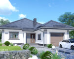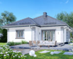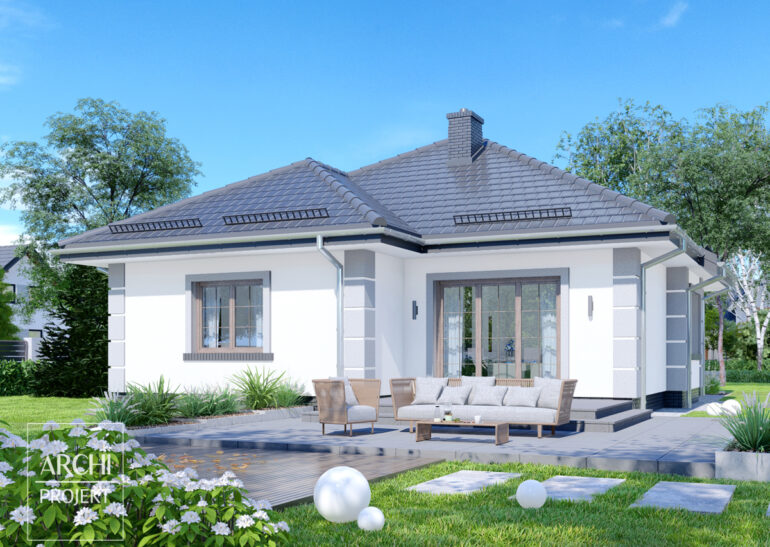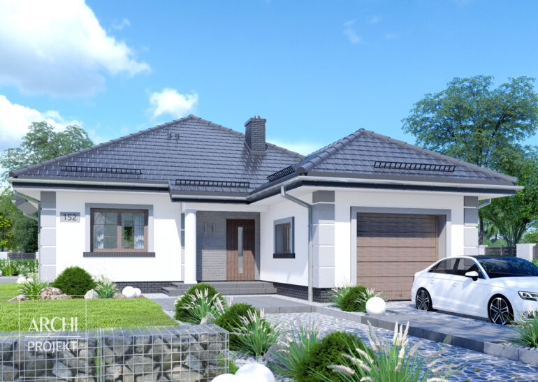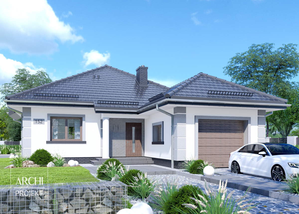 Parterowy dom o sympatycznym wyglądzie, z harmonijną bryłą dachu i przestronnym wnętrzem, dzięki swojej funkcjonalności może zapewnić wygodę użytkowania 3-4 osobowej rodzinie. Wejście do domu osłonięte wydłużonym okapem dachu i ścianą garażu, izoluje od niekorzystnych warunków atmosferycznych i hałasu. Przedsionek z miejscem na szafę ubraniową prowadzi do centralnie usytuowanego hallu. Zwarty układ funkcjonalny pozwolił na zmniejszenie powierzchni hallu, dzięki czemu powierzchnia pokoi jest odpowiednio większa. Kuchnia z wydzieloną spiżarnią ma wystarczającą powierzchnię dla swobodnego użytkowania. Część dzienna jest przestronna, a równocześnie przytulna. Jadalnia z wykuszem sąsiaduje bezpośrednio z kuchnią. W salonie nie zabrakło miejsca na kominek, a z części wypoczynkowej - wyjścia na narożny taras. Część sypialna stanowi wyraźnie wydzieloną część i zawiera dwie sypialnie i dużą łazienkę, oraz garderoby. Część gospodarcza z kotłownią połączona jest z częścią mieszkalną poprzez wiatrołap. Garaż wkomponowany w bryłę budynku od strony frontowej umożliwia lokalizację domu na wąskich działkach. Możliwe zmiany adaptacyjne: - powiększenie jadalni o większy wykusz, - połączenie kuchni z jadalnią, - powiększenie sypialni kosztem garderób - połączenie łazienki i wc.