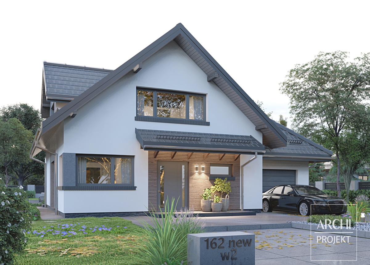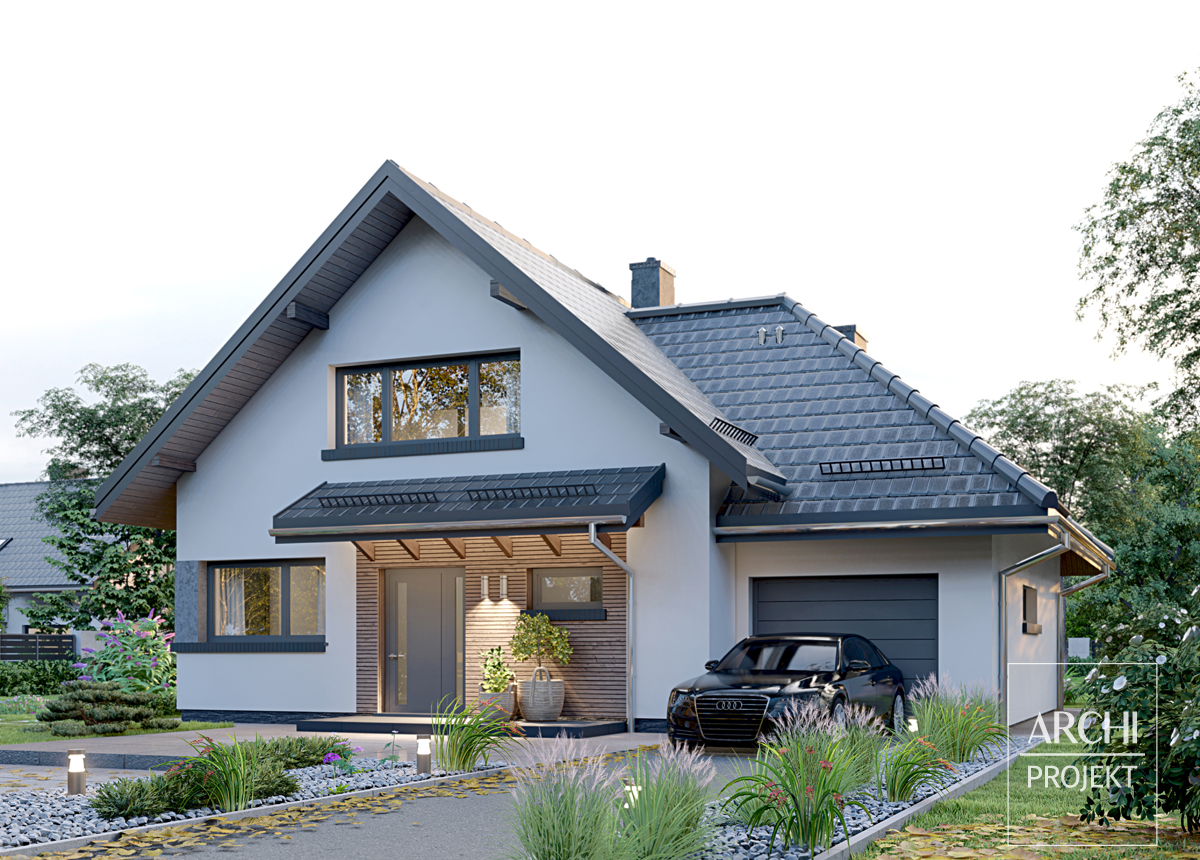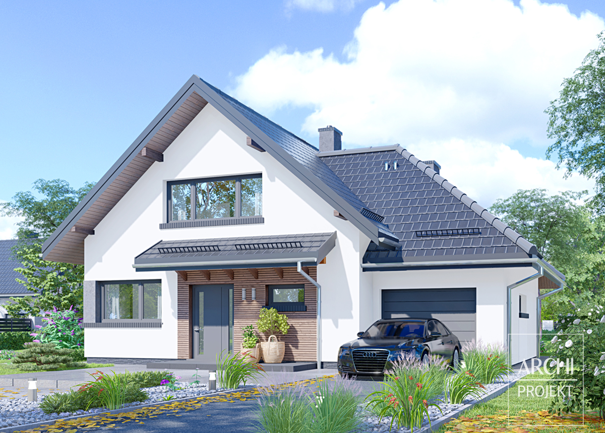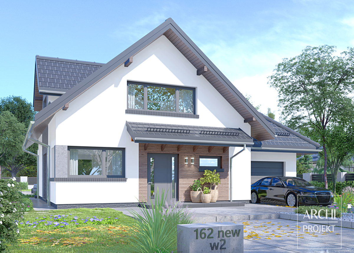 Funkcjonalny dom o atrakcyjnej nowoczesnej sylwetce i przejrzystym układzie wewnętrznym dla 4-5 osobowej rodziny i garażem wkomponowanym w bryłę domu. Daszek oparty na filarach osłania wejście do domu - bardzo praktyczne rozwiązanie w naszym klimacie. Przedsionek wejściowy posiada miejsce na szafę wnękową, obok znajduje się mała łazienka i garderoba. Część dzienna domu, składająca się z wygodnej kuchni (od strony frontowej), jadalni w wykuszu i obszernego pokoju dziennego z kominkiem zyskuje jeszcze na przestronności dzięki przestrzennemu połączeniu z hallem. Szerokie drzwi tarasowe zapewniają dobre oświetlenie pokoju dziennego. Poddasze zawiera trzy foremne sypialnie, garderobę i łazienkę (bez skosów), oraz strych nad garażem (z wejściem z półpiętra), który może stanowić rezerwę powierzchni np. na dodatkowy pokój lub pomieszczenie rekreacyjne. Garaż i kotłownia - na poziomie zbliżonym do poziomu terenu. Zobacz także projekt APS 162 w tradycyjnej stylizacji.