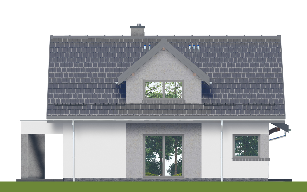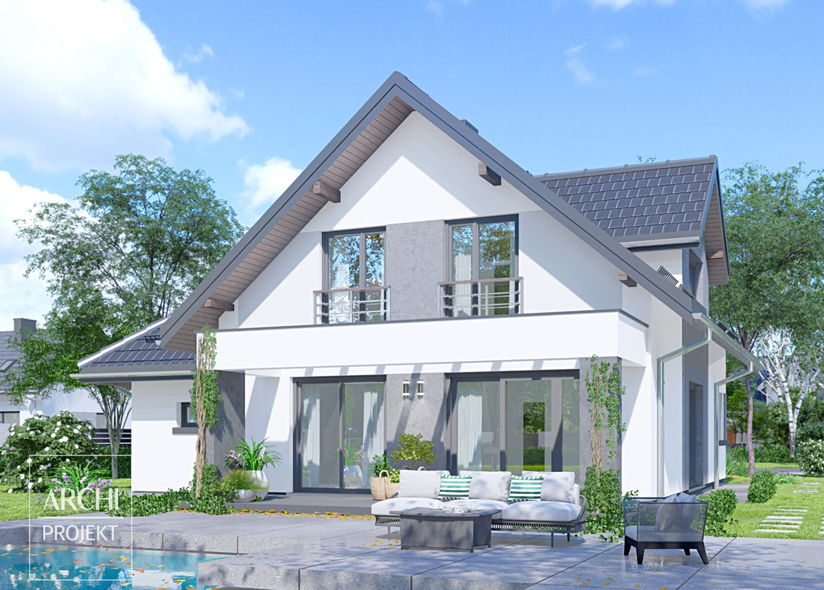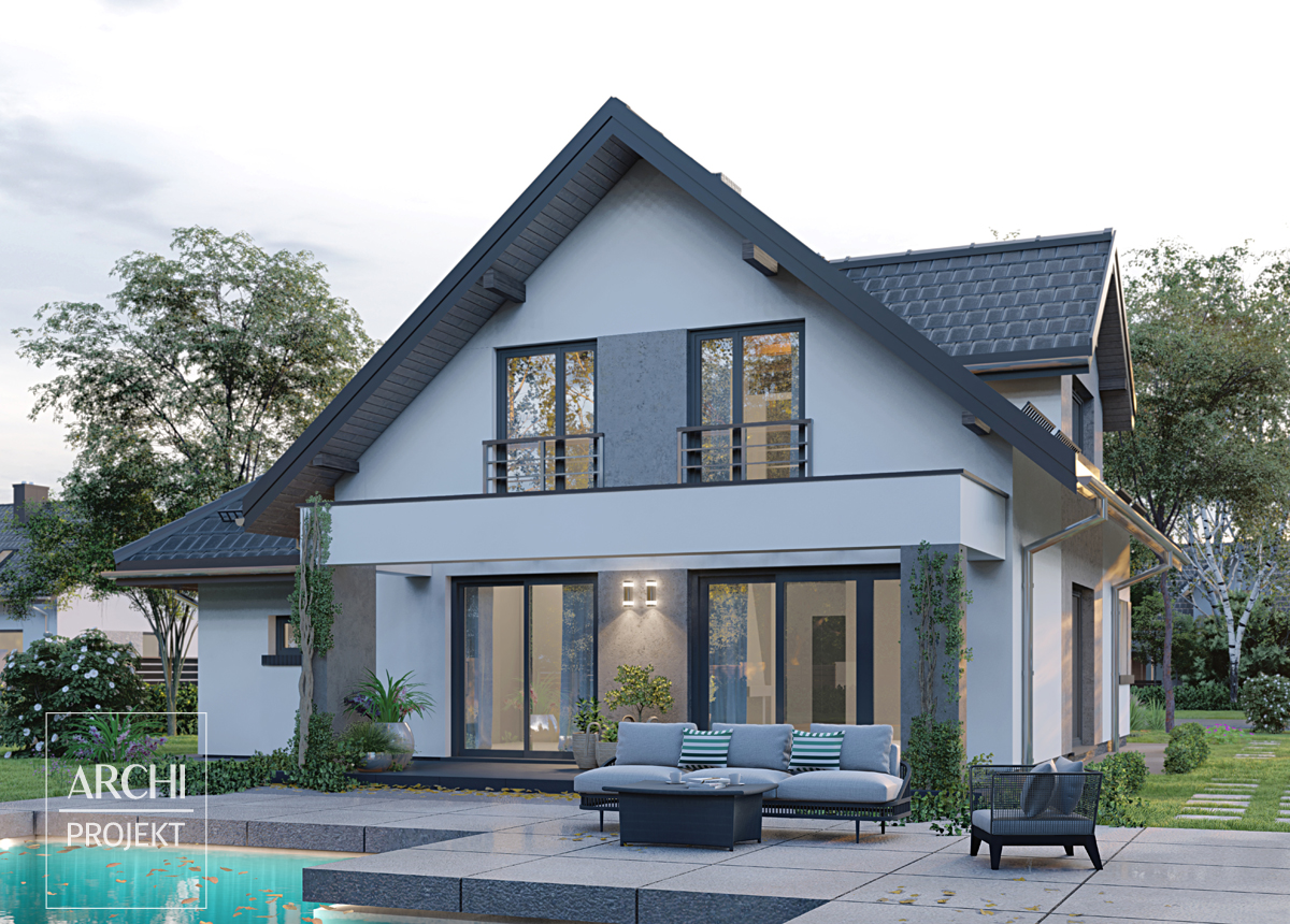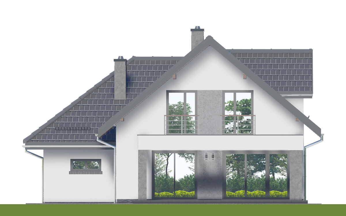 Funkcjonalny dom o atrakcyjnej nowoczesnej sylwetce i przejrzystym układzie wewnętrznym dla 4-5 osobowej rodziny i garażem wkomponowanym w bryłę domu. Daszek oparty na filarach osłania wejście do domu - bardzo praktyczne rozwiązanie w naszym klimacie. Przedsionek wejściowy posiada miejsce na szafę wnękową, obok znajduje się mała łazienka i garderoba. Część dzienna domu, składająca się z wygodnej kuchni (od strony frontowej), jadalni w wykuszu i obszernego pokoju dziennego z kominkiem zyskuje jeszcze na przestronności dzięki przestrzennemu połączeniu z hallem. Szerokie drzwi tarasowe zapewniają dobre oświetlenie pokoju dziennego. Poddasze zawiera trzy foremne sypialnie, garderobę i łazienkę (bez skosów), oraz strych nad garażem (z wejściem z półpiętra), który może stanowić rezerwę powierzchni np. na dodatkowy pokój lub pomieszczenie rekreacyjne. Garaż i kotłownia - na poziomie zbliżonym do poziomu terenu. Zobacz także projekt APS 162 w tradycyjnej stylizacji.