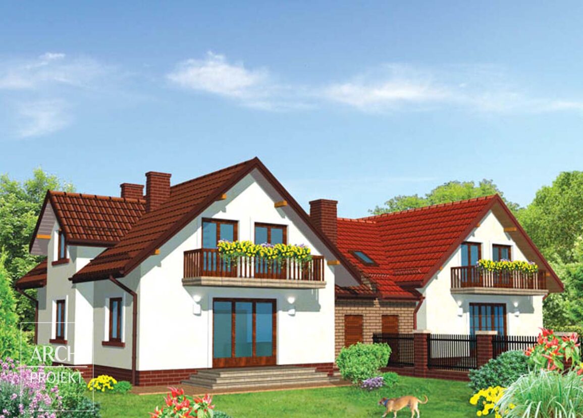 Zgrabny dom bliźniaczy o praktycznym układzie pomieszczeń i atrakcyjnej sylwetce, dla 4-6 osobowej rodziny, z garażem dwustanowiskowym umieszczonym w bryle budynku. Wejście do domu osłonięte podcieniem prowadzi do przedsionka z miejscem na szafę wnękową i dalej do centralnie usytuowanego hallu z efektownymi schodami. Od strony frontowej znajduje się pokój-gabinet, za nim zgrabna kuchnia, sąsiadująca z położonym w głębi domu wielofunkcyjnym pokojem dziennym. Pomiędzy pokojem a kuchnią - kominek. Szerokie przeszklone drzwi prowadzą na osłonięty szerokim balkonem taras. Pod schodami - przejście do dwustanowiskowego garażu i kotłowni, obok – wc. Na poddaszu znajduje się część sypialna składająca się z czterech sypialni (jedna na półpiętrze z łazienką), garderoby i dużej łazienki. Dostępna wersja projektu z piwnicą - APS 167. Możliwe zmiany adaptacyjne: - powiększenie kuchni poprzez wysunięcie ściany zewnętrznej, - powiększenie pokoju dziennego o wykusz pod balkonem. POWYŻSZA CENA DOTYCZY JEDNEGO SEGMENTU