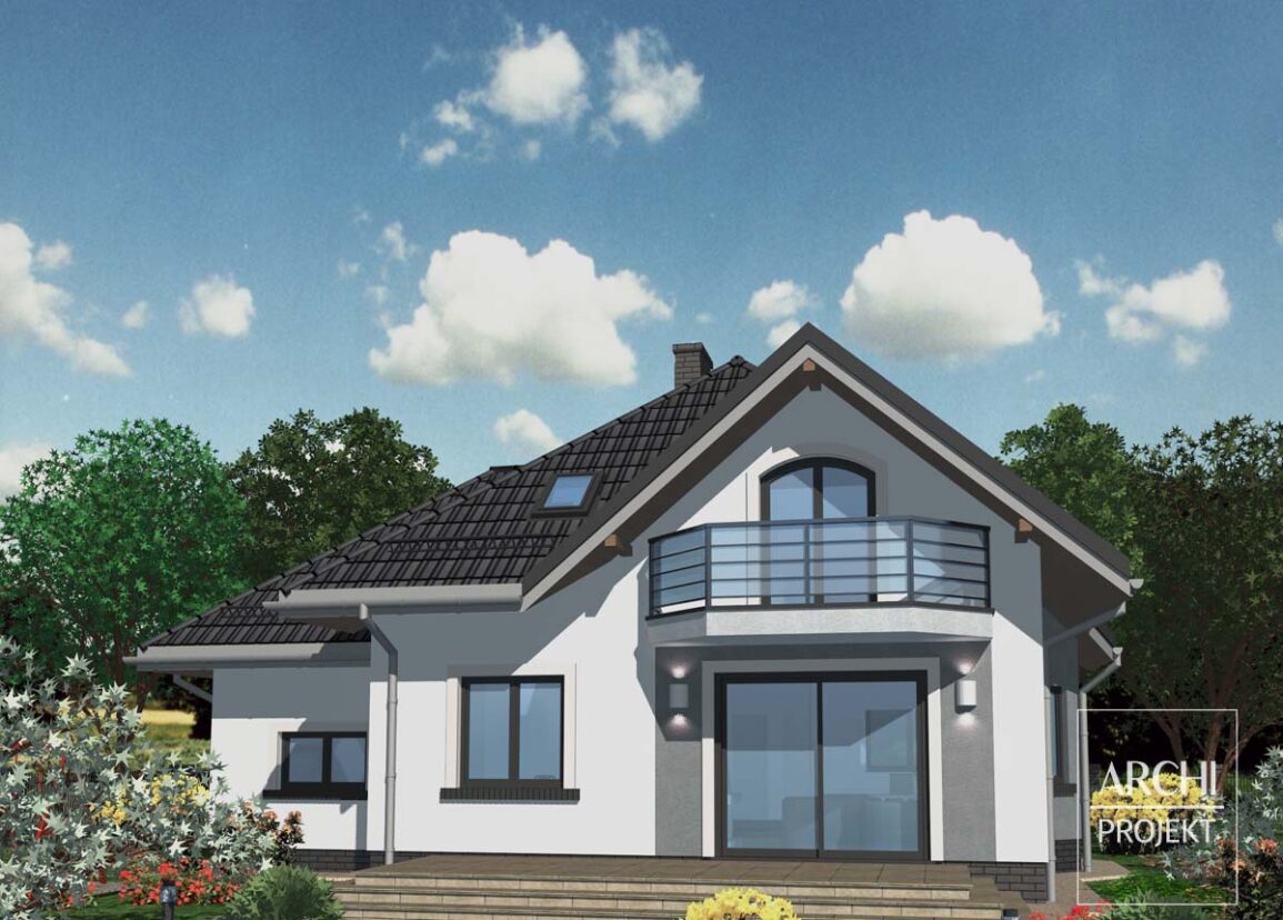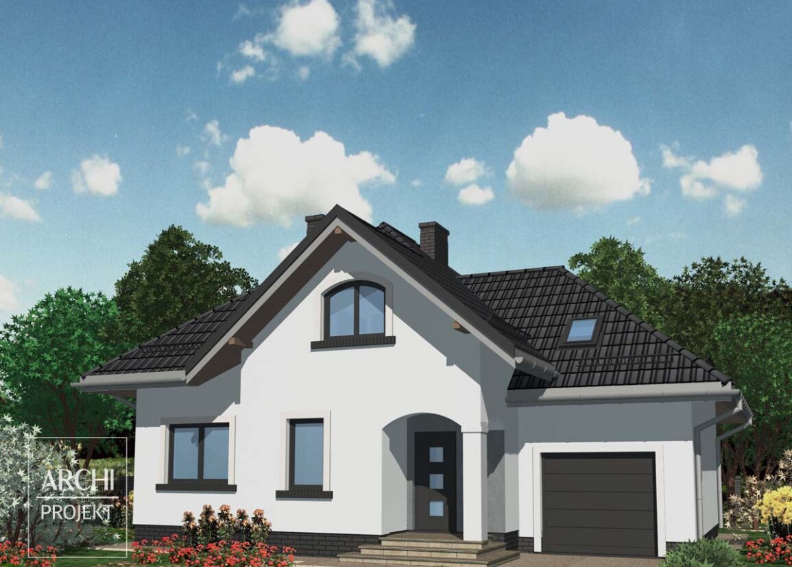Efektowny dom o harmonijnej, proporcjonalnej sylwetce i wygodnych wnętrzach, dla 4-5 osobowej rodziny, z garażem wkomponowanym w bryłę domu. Układ pomieszczeń części dziennej pozwala na realizację domu na różnorodnie usytuowanych względem stron świata działkach. Wejście do domu, zlokalizowane w narożnikowym podcieniu, prowadzi do wiatrołapu z miejscem na szafę wnękową i dalej do hallu z klatką schodową. Usytuowana od strony frontowej wygodna kuchnia sąsiaduje z jadalnią w wykuszu. Jadalnia stanowi część pokoju dziennego, którego część wypoczynkowa z kominkiem i wyjściem na szeroki taras znajduje się w głębi domu, od strony ogrodowej. Na parterze znajdują się także: drugi mniejszy pokój - obok salonu, łazienka, oraz kotłownia - obok kuchni. Przejście do garażu - pod schodami na poddasze. Na poddaszu znajduje się część sypialna z trzema sypialniami, garderobą i łazienką. Strych nad garażem stanowi rezerwę powierzchni do wykorzystania na pomieszczenie użytkowe. Wersja projektu z garażem dwustanowiskowym: APS 169+2G. Zobacz także projekt - APS 010, APS 148, APS 148 NEW.