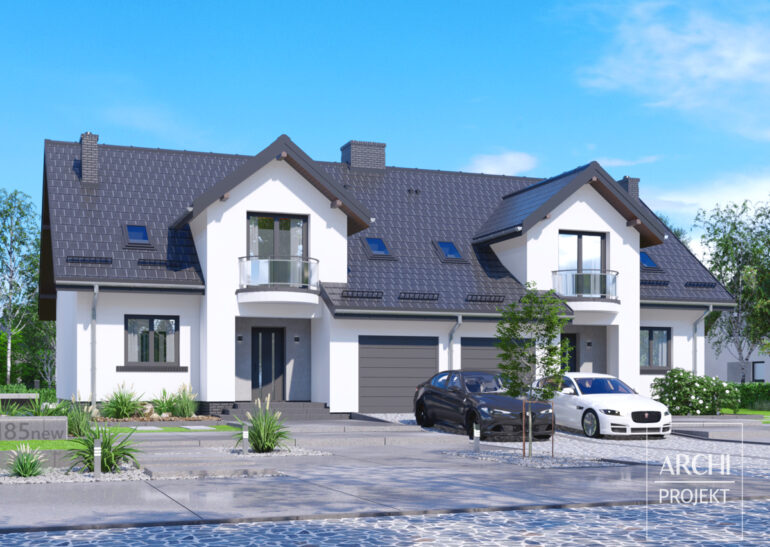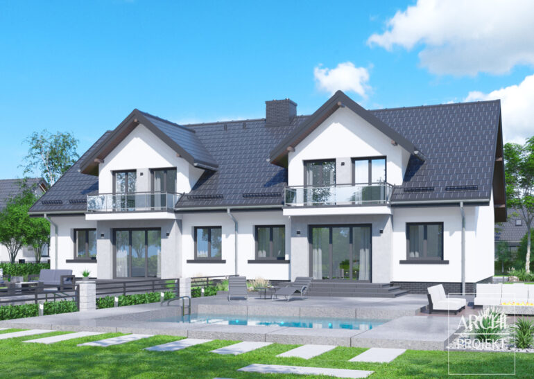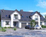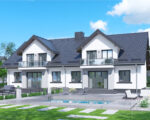Przestronny dom dwulokalowy w nowej, odświeżonej odsłonie (składajacy sie z dwóch bliźniaczych segmentów) o efektownej sylwetce i praktycznym układzie pomieszczeń, zapewniającym mieszkańcom odpowiedni komfort. Każdy segment segment dla 4-5 osobowej rodziny. Garaż wkomponowany w bryłę budynku. Wejście do domu, osłonięte praktycznym podcieniem, prowadzi do przedsionka i dalej do hallu. Obok wejścia do domu - wjazd do garażu, a za nim - kotłownia. Od strony frontowej znajduje się zgrabna kuchnia z miejscem na małą jadalnię i ze spiżarnią pod schodami. W głębi domu, na wprost wejścia, zlokalizowany jest pokój dzienny z narożnym kominkiem, a obok znajduje się dodatkowy pokój, który może pełnić funkcję gabinetu lub gościnnej sypialni. Na poddaszu zlokalizowane są 3 obszerne sypialnie z balkonami, garderoby i łazienka. POWYŻSZA CENA DOTYCZY CAŁEGO PROJEKTU