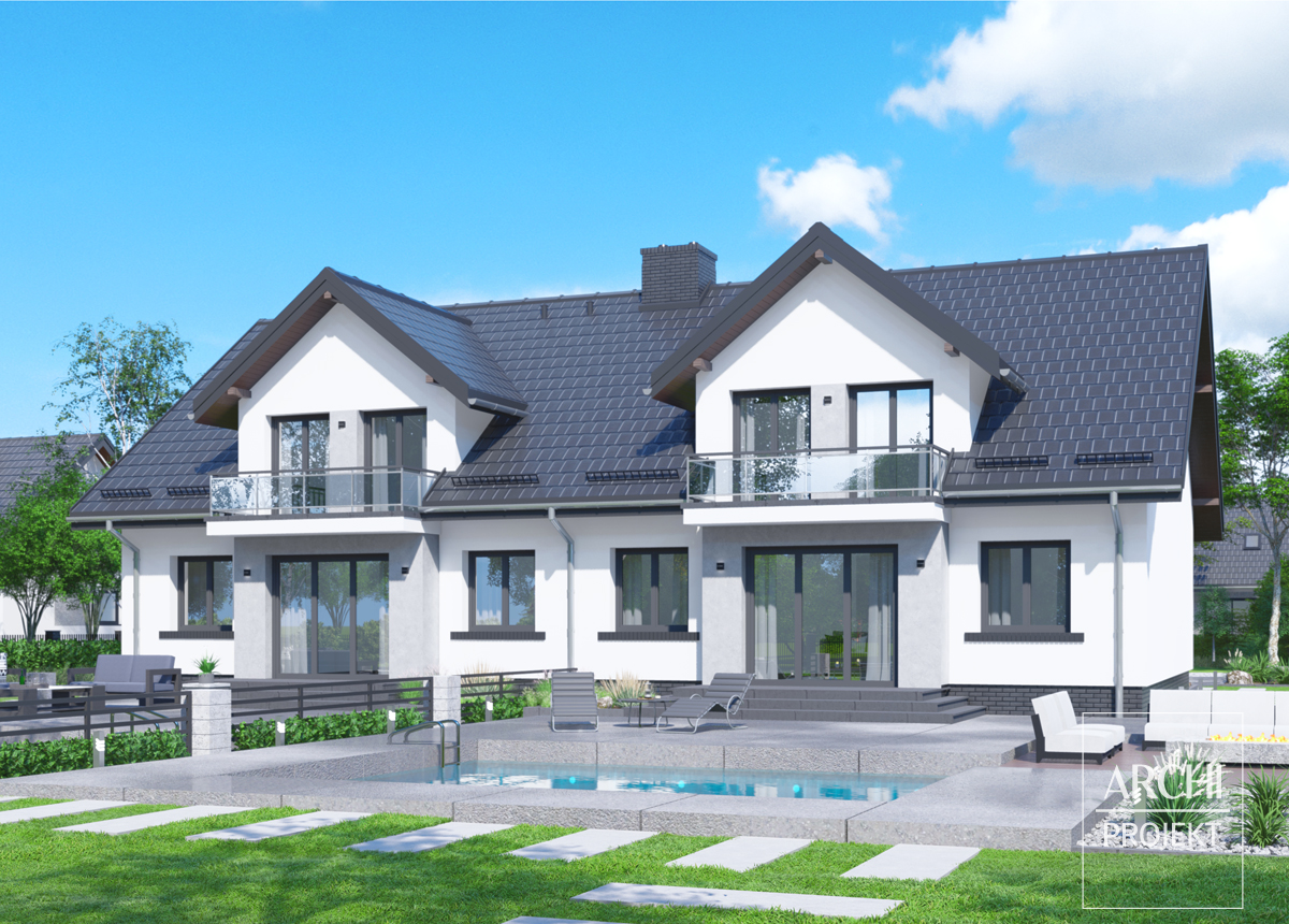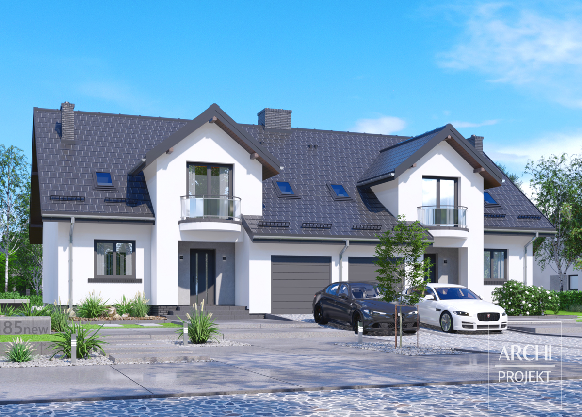 Przestronny dom dwulokalowy w nowej, odświeżonej odsłonie (składajacy sie z dwóch bliźniaczych segmentów) o efektownej sylwetce i praktycznym układzie pomieszczeń, zapewniającym mieszkańcom odpowiedni komfort. Każdy segment segment dla 4-5 osobowej rodziny. Garaż wkomponowany w bryłę budynku. Wejście do domu, osłonięte praktycznym podcieniem, prowadzi do przedsionka i dalej do hallu. Obok wejścia do domu - wjazd do garażu, a za nim - kotłownia. Od strony frontowej znajduje się zgrabna kuchnia z miejscem na małą jadalnię i ze spiżarnią pod schodami. W głębi domu, na wprost wejścia, zlokalizowany jest pokój dzienny z narożnym kominkiem, a obok znajduje się dodatkowy pokój, który może pełnić funkcję gabinetu lub gościnnej sypialni. Na poddaszu zlokalizowane są 3 obszerne sypialnie z balkonami, garderoby i łazienka. POWYŻSZA CENA DOTYCZY CAŁEGO PROJEKTU